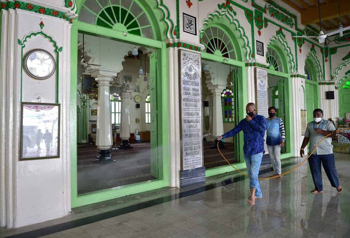 Bengaluru: A worker sprays disinfectant at a mosque ahead of its re-opening, during the ongoing COVID-19 lockdown, in Bengaluru, Saturday, June 6, 2020. (PTI Photo/Shailendra Bhojak)(PTI06-06-2020_000097B)