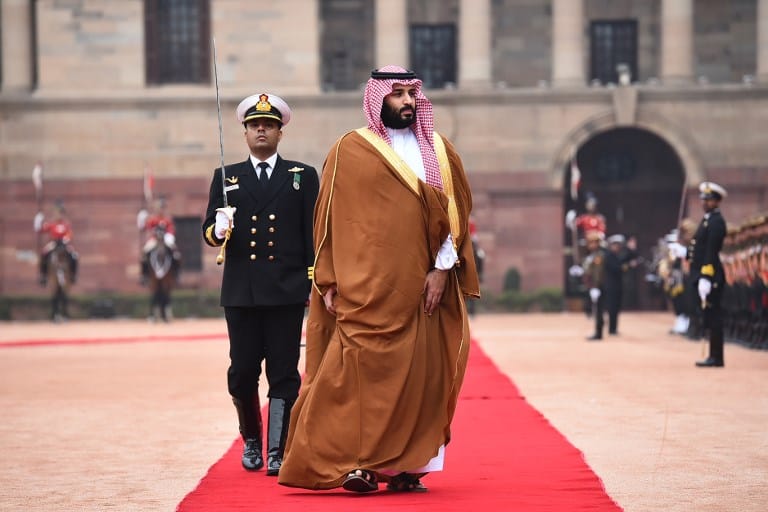 This handout photograph released by India’s Ministry of External Affairs (MEA) on February 20, 2019 shows Saudi Crown Prince Mohammed bin Salman (C) inspecting a guard of honour during a ceremonial reception at the presidential palace in New Delhi. – Saudi Arabia’s Crown Prince Mohammed bin Salman received a warm welcome in India on February 20, with Riyadh eager to demonstrate it is not an international pariah after the murder of journalist Jamal Khashoggi in October. (Photo by Handout / INDIAN MINISTRY OF EXTERNAL AFFAIRS / AFP) / RESTRICTED TO EDITORIAL USE – MANDATORY CREDIT “AFP PHOTO / Indian Ministry of External Affairs (MEA)” – NO MARKETING NO ADVERTISING CAMPAIGNS – DISTRIBUTED AS A SERVICE TO CLIENTS –