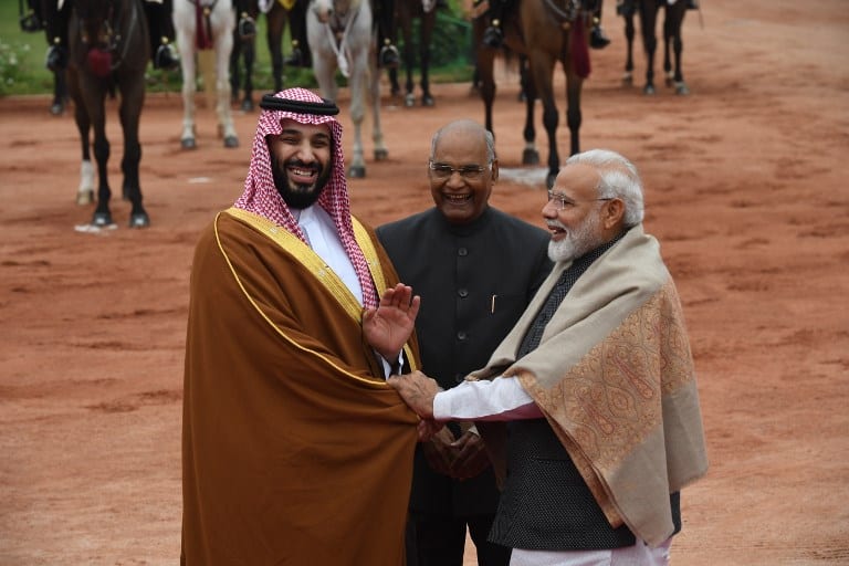 India’s President Ram Nath Kovind (C) looks on as Saudi Crown Prince Mohammed bin Salman (L) and India’s Prime Minister Narendra Modi shake hands during a ceremonial reception at the presidential palace in New Delhi on February 20, 2019. (Photo by PRAKASH SINGH / AFP)