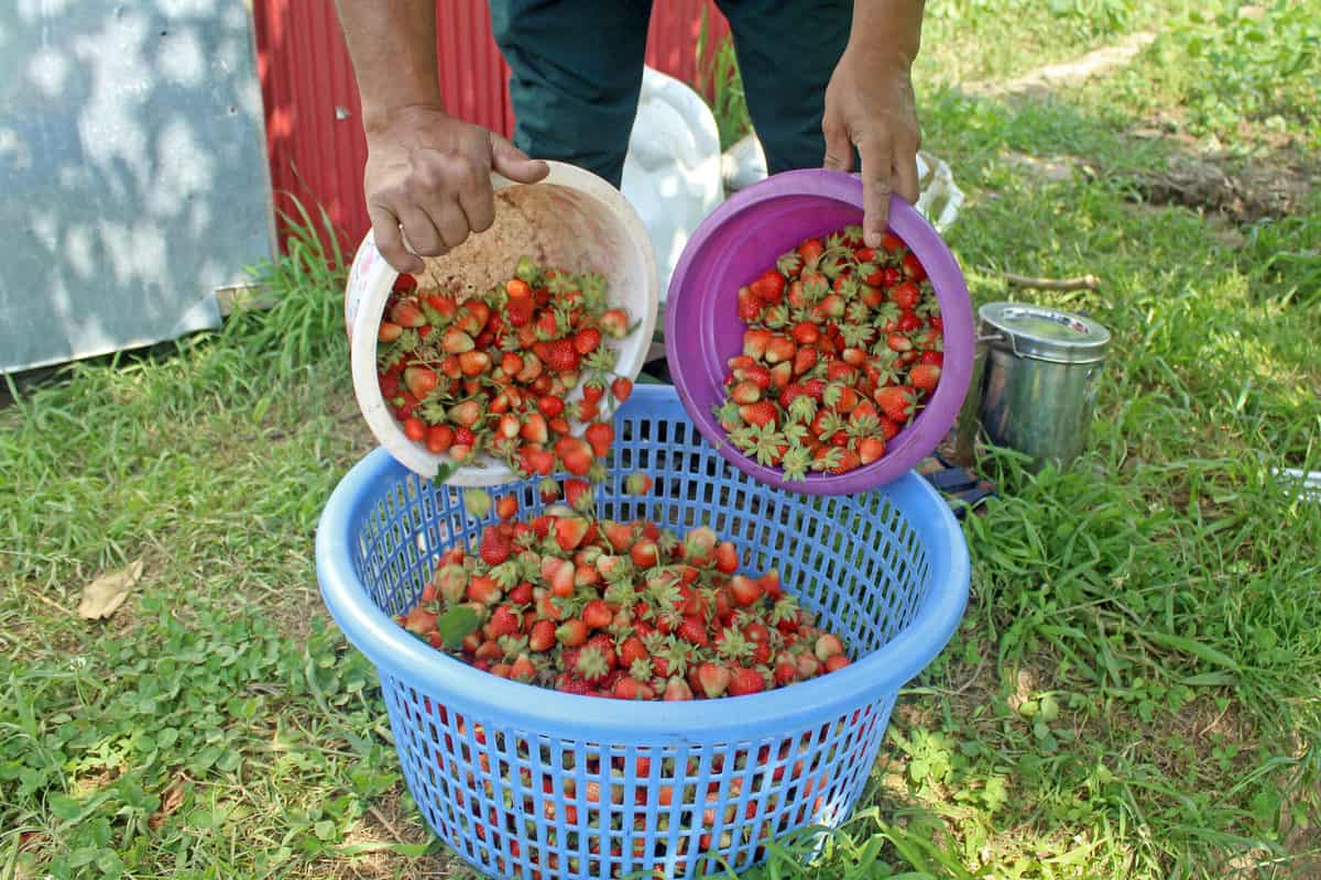 After picking the strawberries the farmers take them home, to pack them in plastic boxes before selling them at the fruit mandi. The fruit, due to its perishable nature and extremely short shelf-life needs to be transported quickly for consumption.