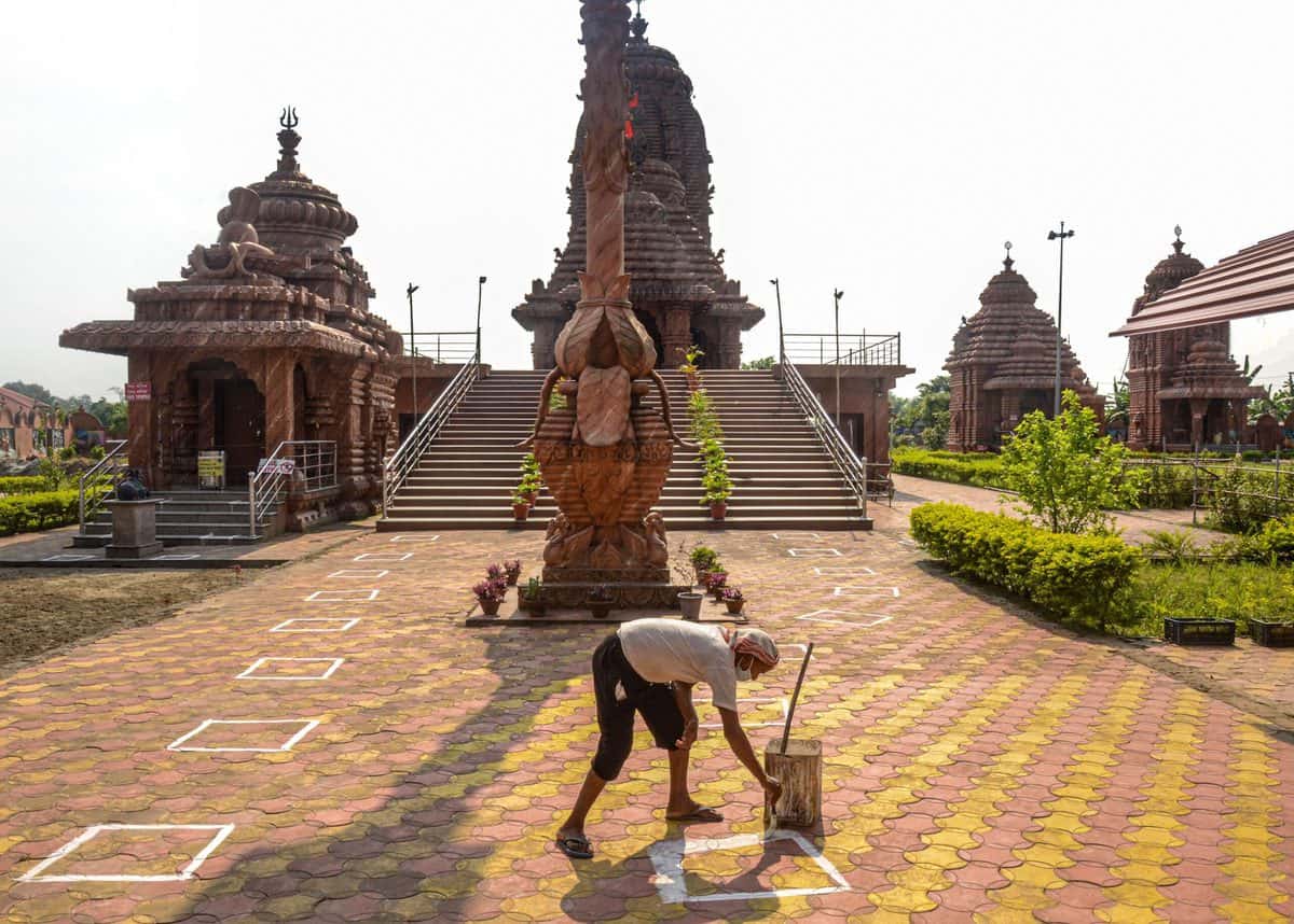 Dibrugarh: A worker paints squares in the premises of Jagannath Temple to help maintain the social distancing norms, ahead of its reopening, in Dibrugarh, Monday, June 8, 2020. (PTI Photo)(PTI08-06-2020_000266B)