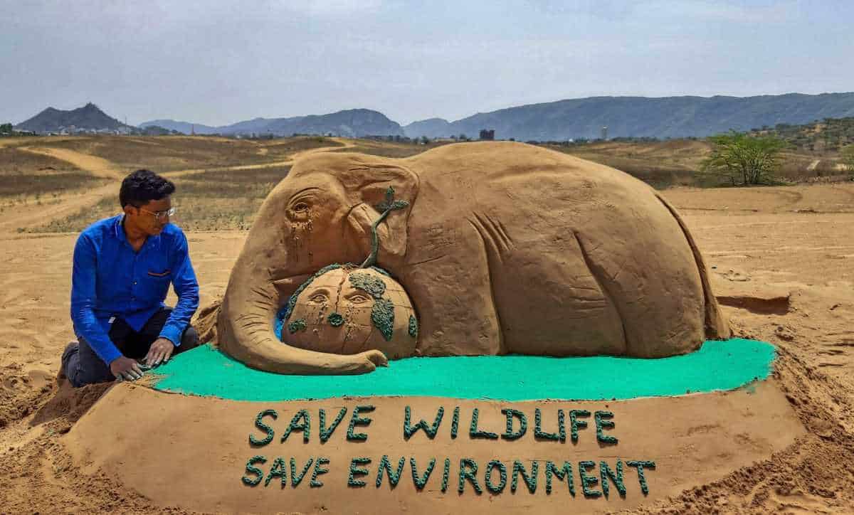Pushkar: Sand artist Ajay Rawat gives final touches to sand sculpture of an elephant, representing the recently killed wild pregnant elephant of Kerala, with the message ‘Save Wildlife Save Environment’, on the eve of World Environment Day, in Pushkar, Thursday, June 4, 2020. (PTI Photo)