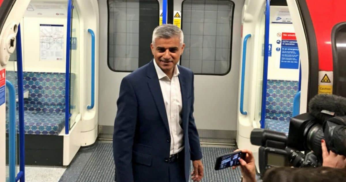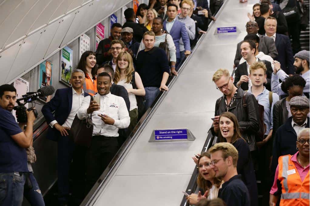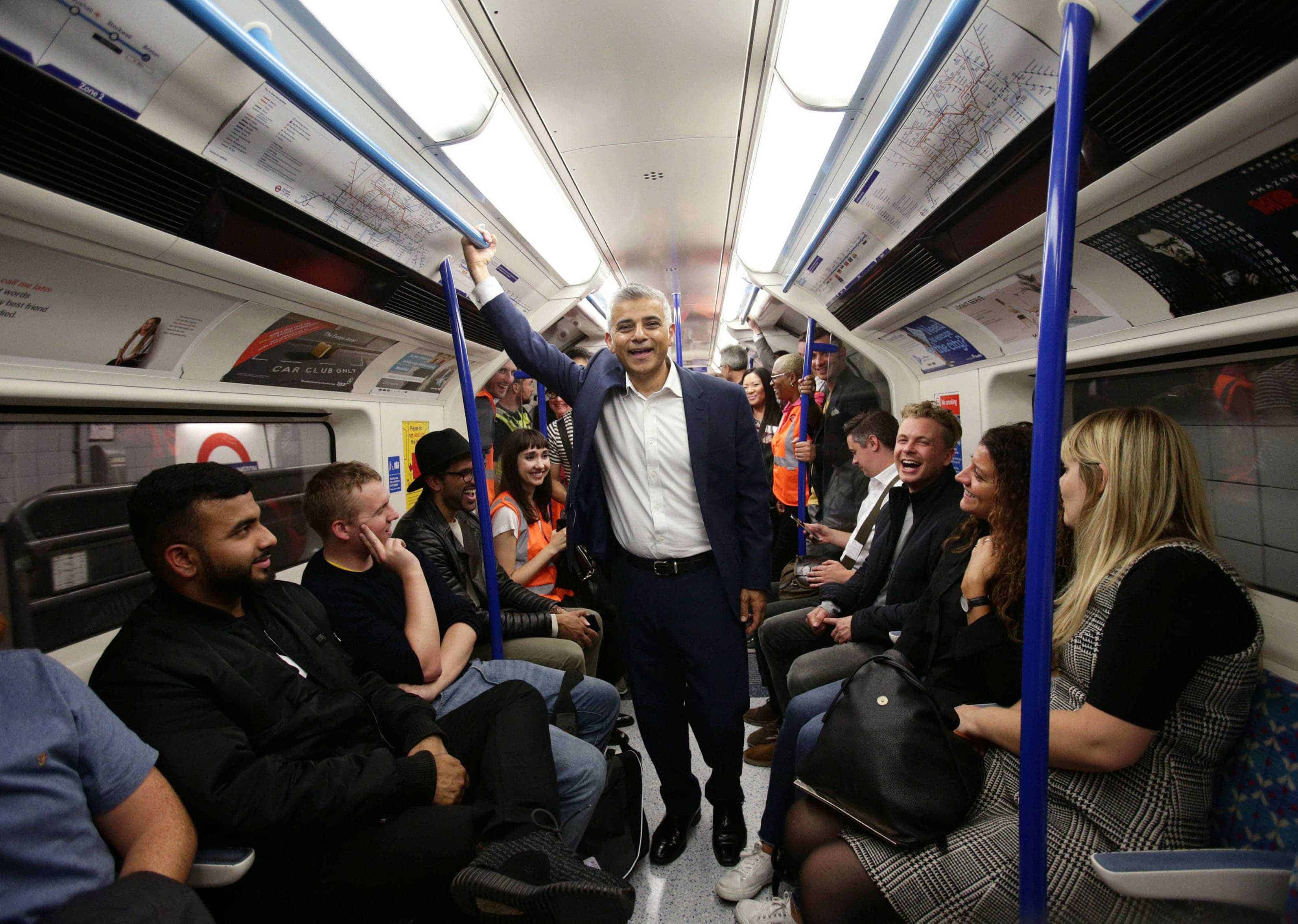 Mayor of London Sadiq Khan traveling with passengers on a northbound Victoria line tube train during the launch of London’s Night Tube. REUTERS
