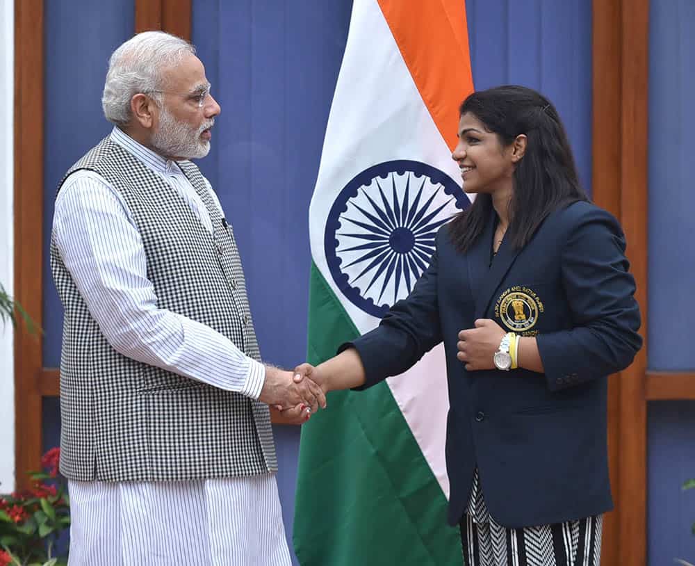 NEW DELHI, AUG 28 (UNI):- Prime Minister Narendra Modi with Rio Olympic Bronze Medal Winner and Rajiv Gandhi Khel Ratna Awardee of 2016, Indian wrestler Sakshi Malik, in New Delhi on Sunday. UNI PHOTO-69U