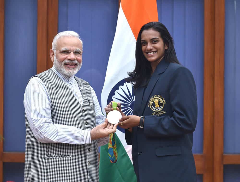 NEW DELHI, AUG 28 (UNI):- Prime Minister Narendra Modi with Rio Olympic Silver Medal Winner and Rajiv Gandhi Khel Ratna Awardee of 2016, Indian shuttler P V Sindhu, in New Delhi on Sunday. UNI PHOTO-72U