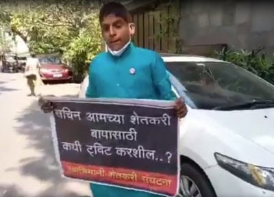 The poster has a simple query: “Sachin, When will you tweet for our farmer-fathers”, grabbing attention from the passersby in Bandra with many clicking his pictures or filming videos.