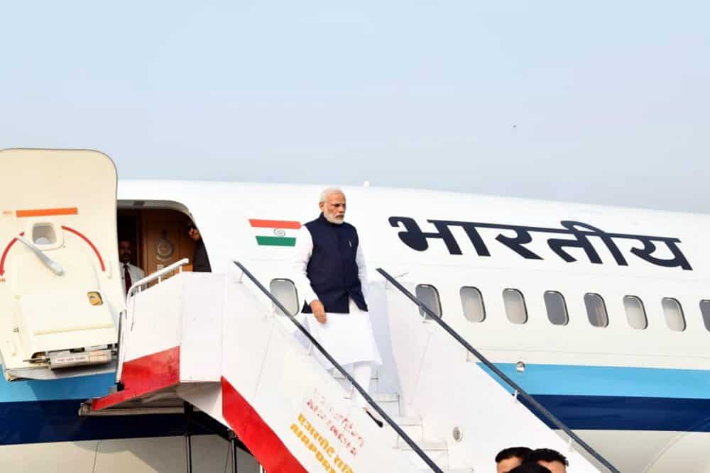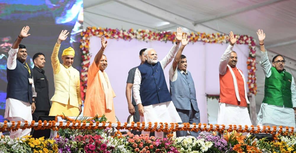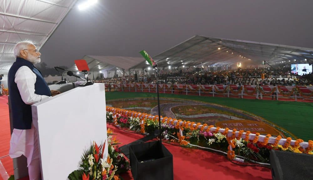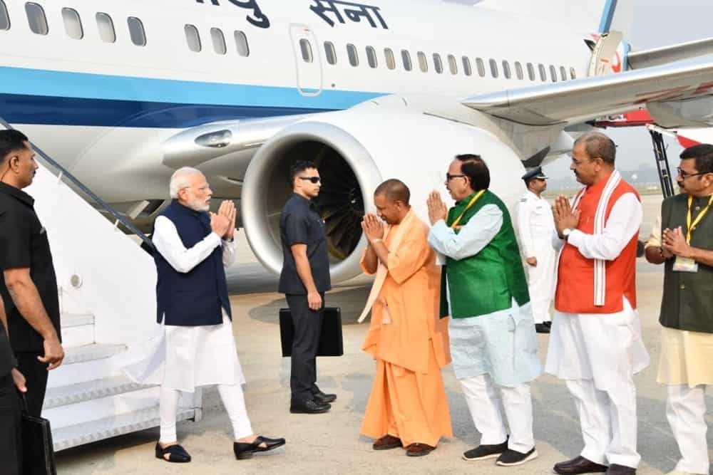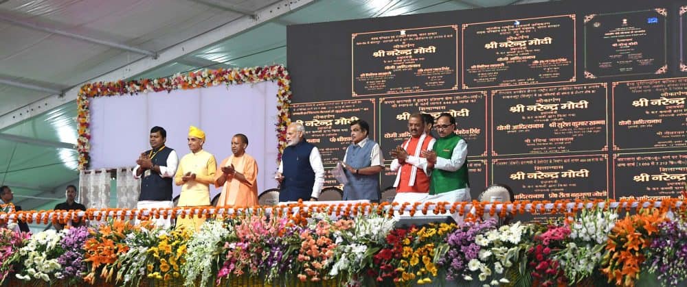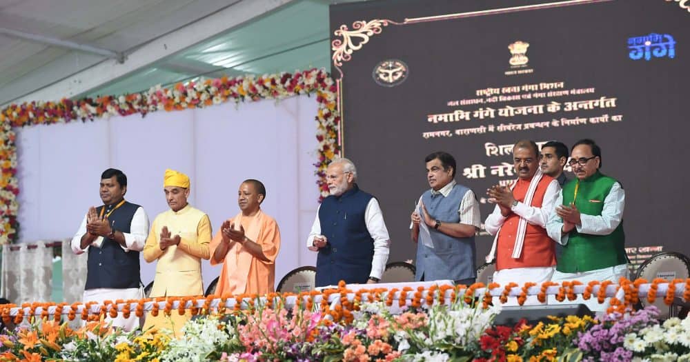 VARANASI: Prime Minister Narendra Modi at the dedication of the India’s First Multi-Modal Terminal on river Ganga to the Nation, in Varanasi, Uttar Pradesh on Monday. Uttar Pradesh Chief Minister Yogi Adityanath and Secretary, Ministry of Shipping Gopal Krishna are also seen. [source_without_link]UNI [/source_without_link]