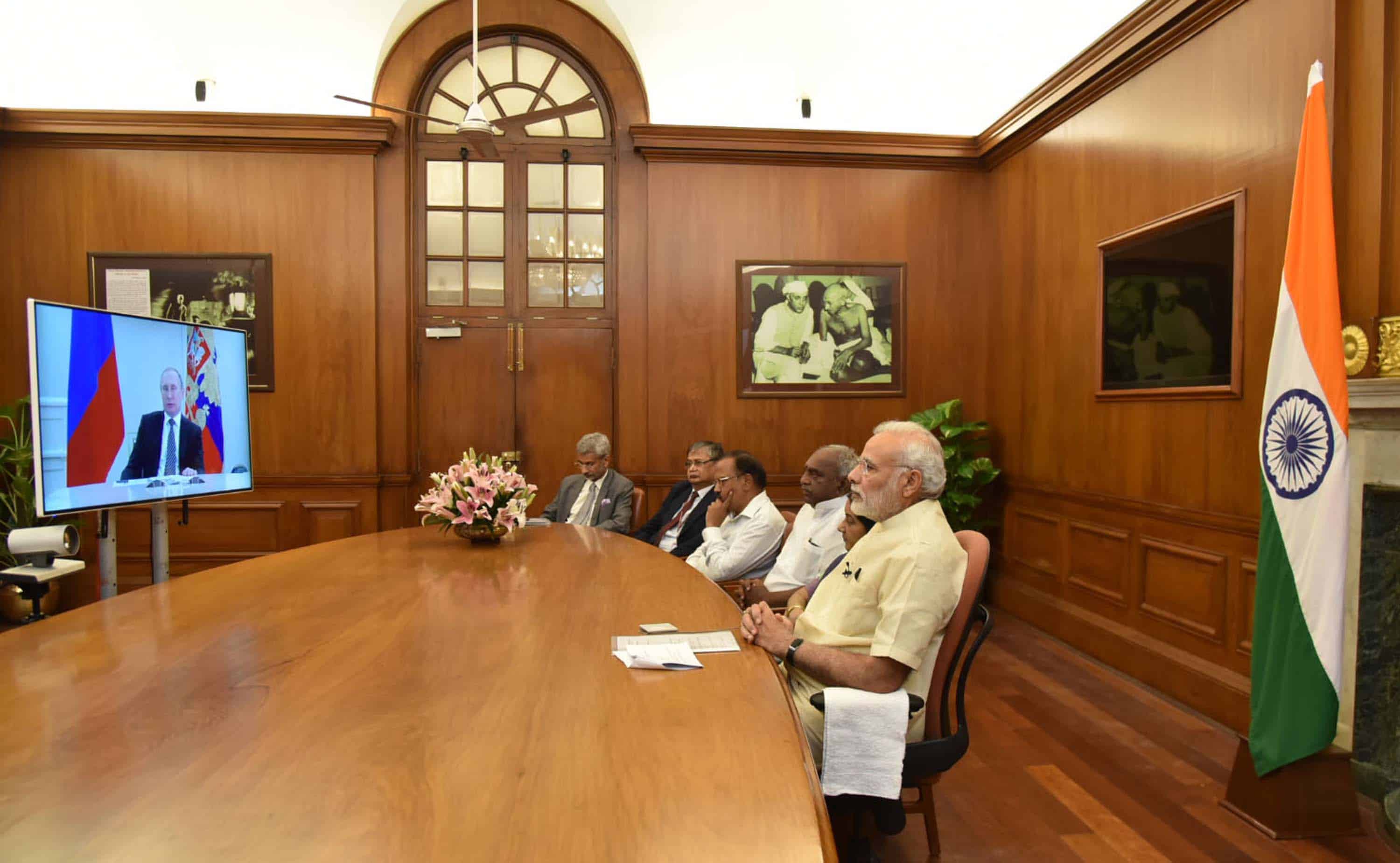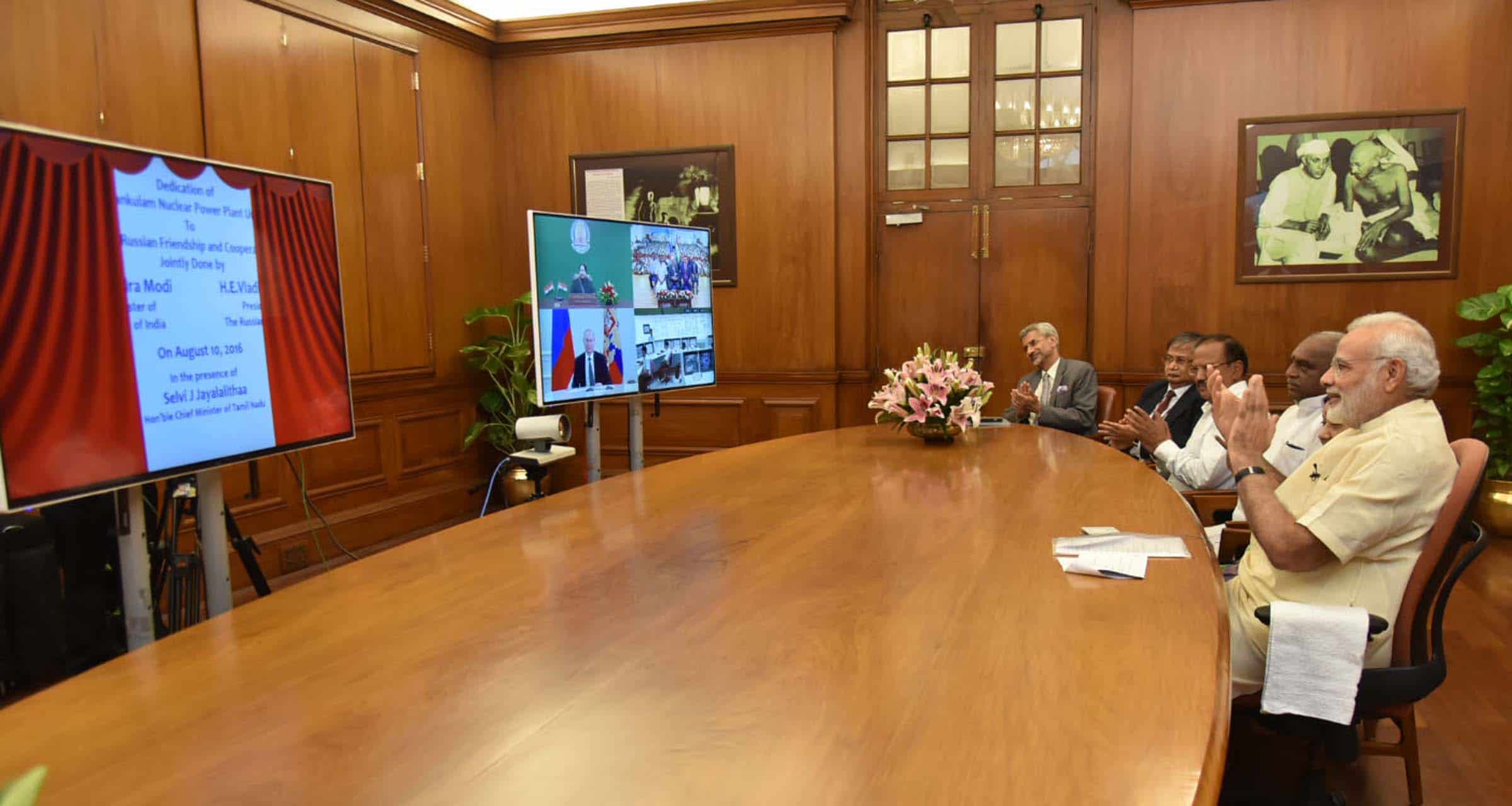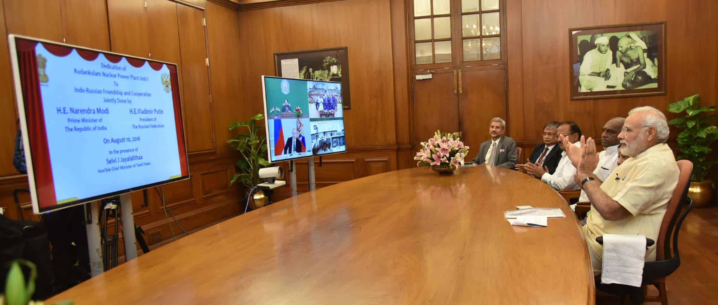 Prime Minister Narendra Modi at dedication Kudankulam nuclear power plant unit-1 to the Nation with Russian President Vladimir Putin and Chief Minister of Tamil Nadu J Jayalalithaa, through video conferencing, in New Delhi Delhi on Wednesday. UNI PHOTO