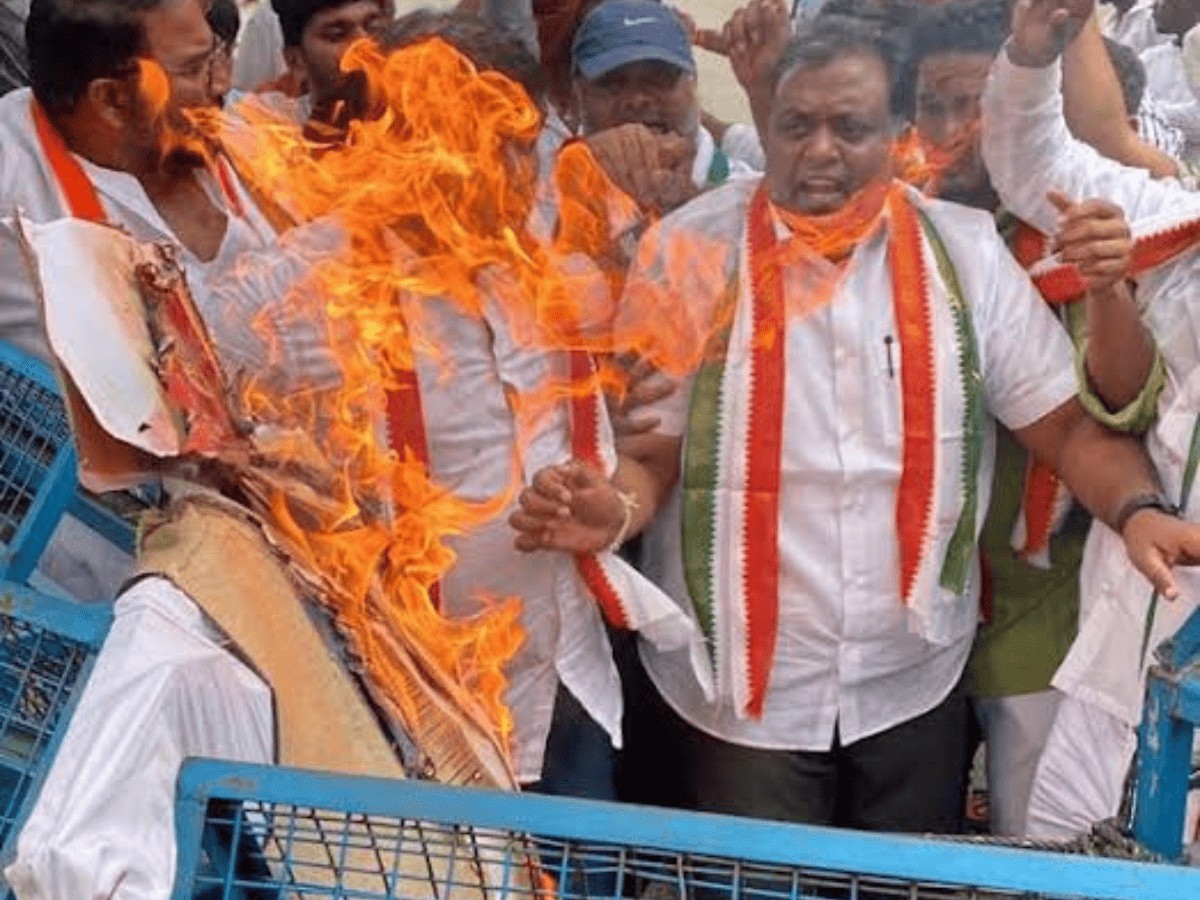 Hyderabad: Congress workers in Hyderabad burnt an effigy of Prime Minister Narendra Modi on Friday to protest the Gujarat High Court’s order rejecting Rahul Gandhi’s plea seeking a stay on conviction over his ‘Modi surname’ remark.