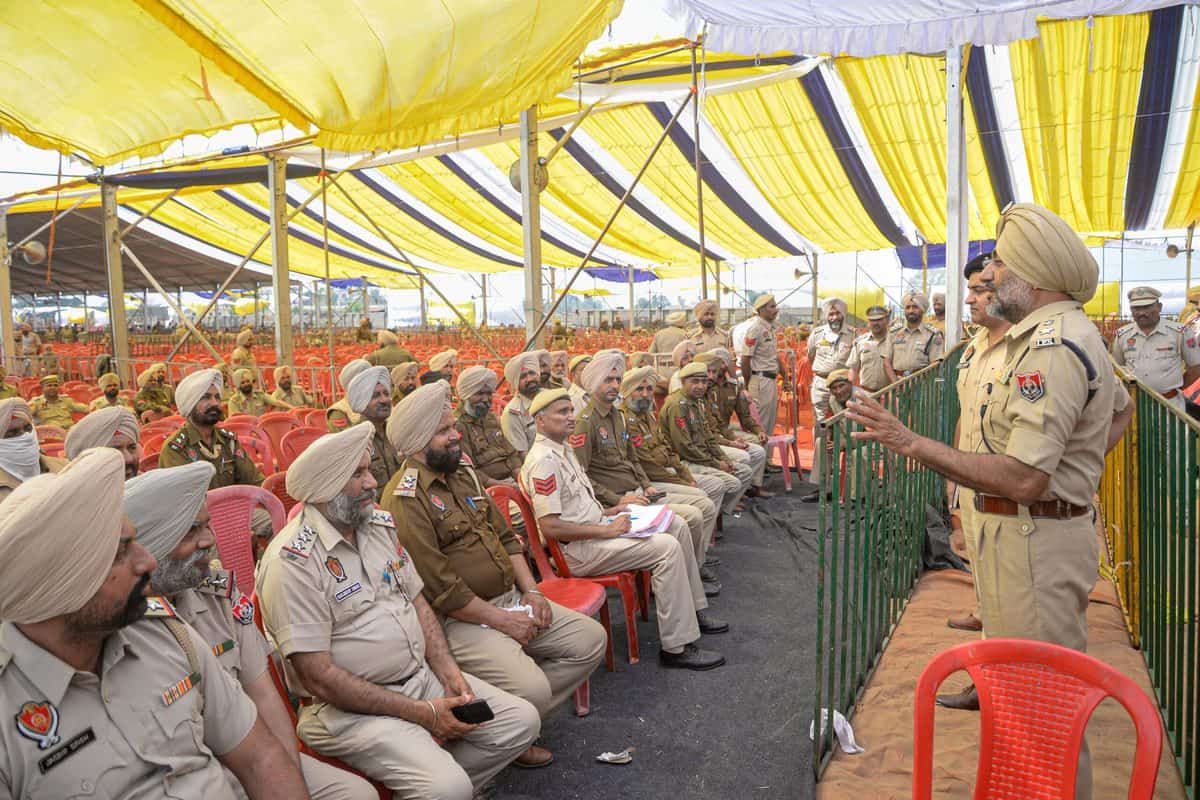 Jalandhar: Security personnel with metal detectors and a dog inspect the venue where AAP’s Punjab CM-designate Bhagwant Mann will take oath as Punjab Chief Minister at Khatkar Kalan, the birthplace of Shaheed Bhagat Singh, in Nawanshahr near Jalandhar, Tuesday, March 15, 2022. (PTI Photo)