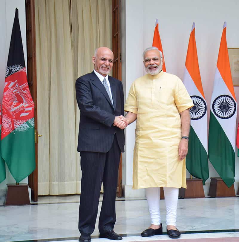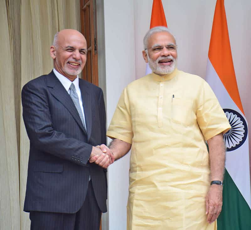 President of Afghanistan Ashraf Ghani being received by Prime Minister Narendra Modi for a meeting at Hyderabad house, in New Delhi on Wednesday. UNI PHOTO
