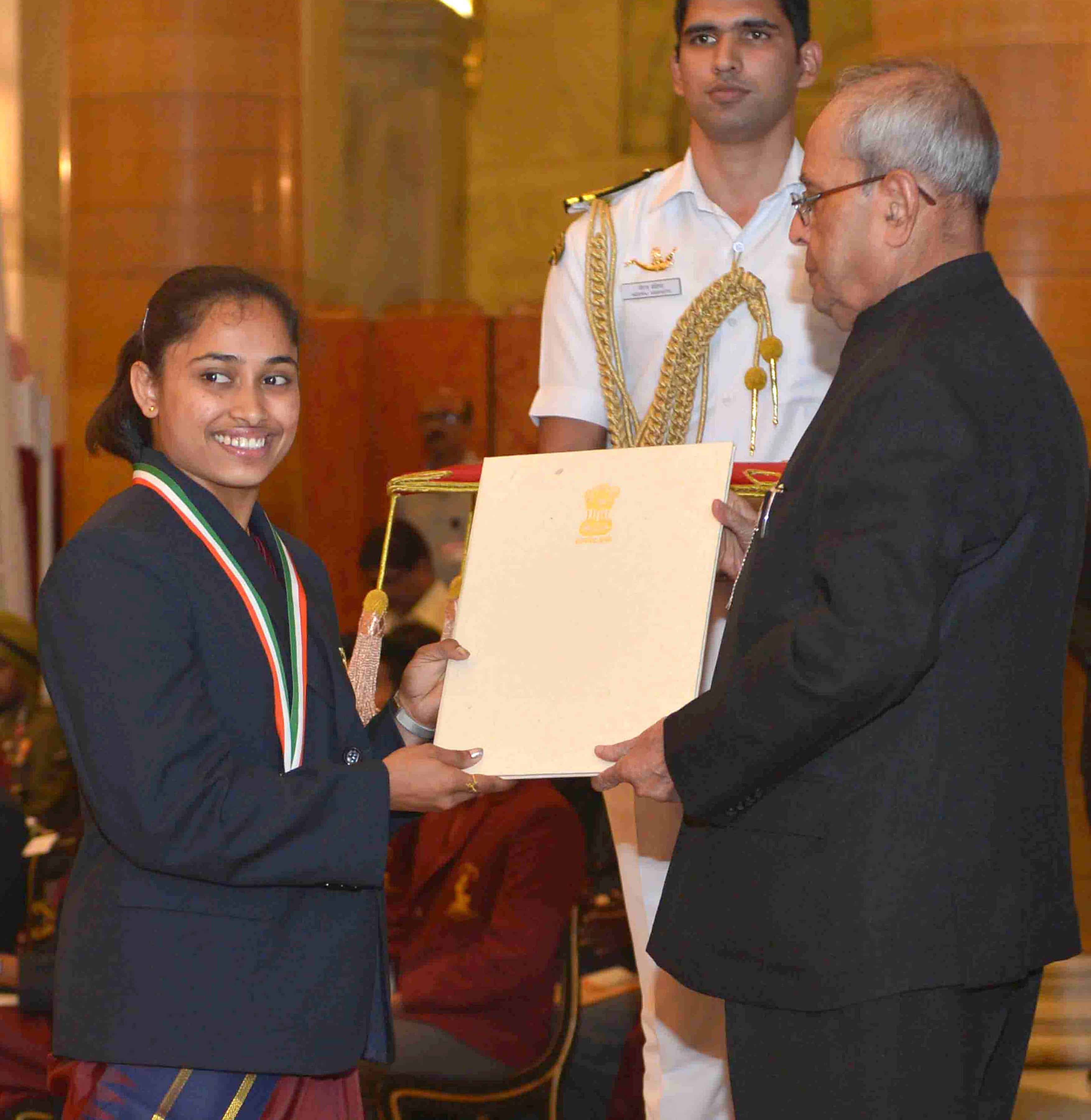 NEW DELHI, AUG 29 (UNI)- President Pranab Mukherjee presenting Rajiv Gandhi Khel Ratna Award to Dipa Karmakar for Gymnastics during award ceremony, at Rashtrapati Bhavan, in New Delhi on Monday. UNI PHOTO-48U
