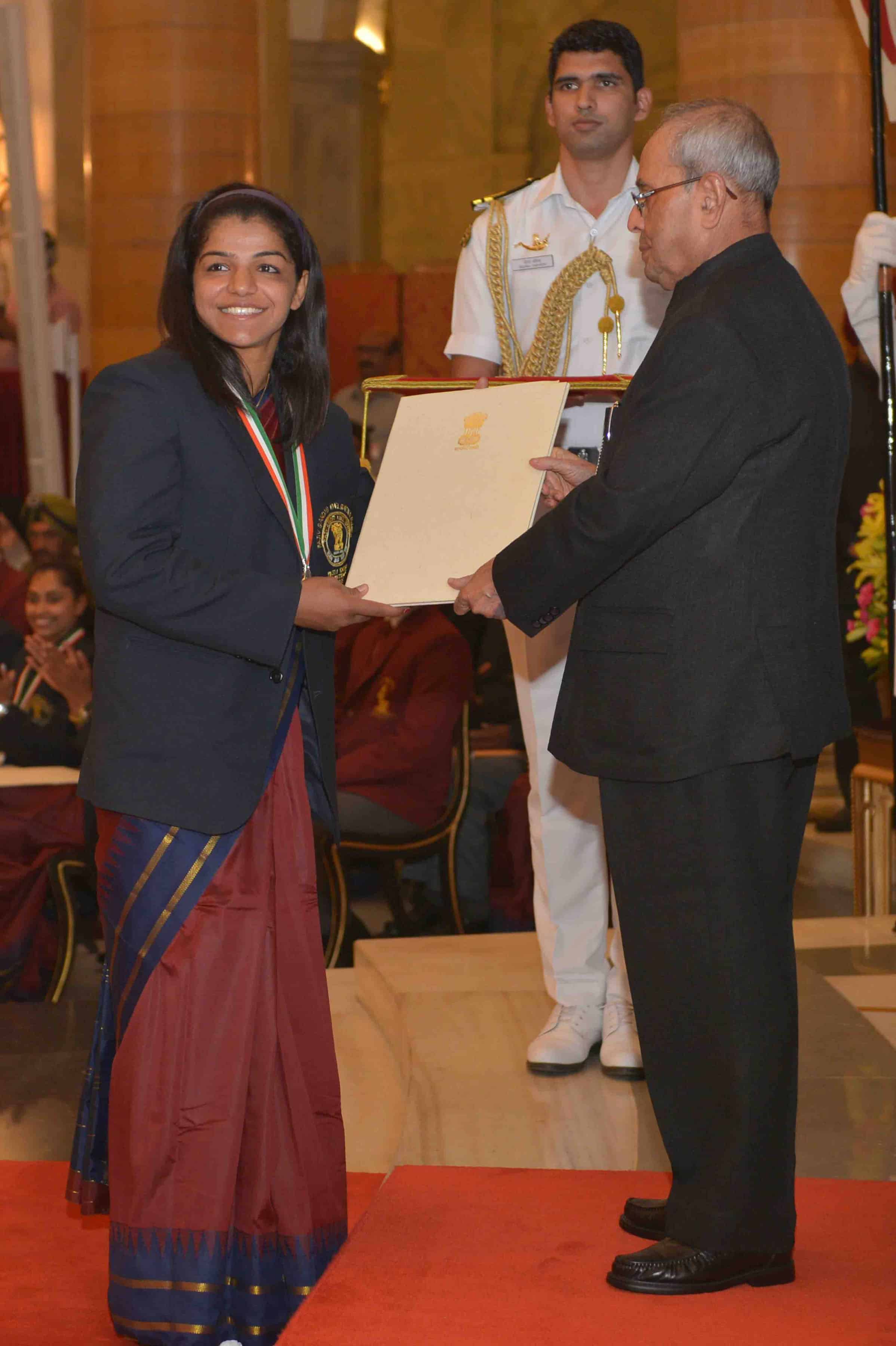NEW DELHI, AUH 29 (UNI)- President Pranab Mukherjee presenting Rajiv Gandhi Khel Ratna Award to Sakshi Malik for Wrestling, during award ceremony, at Rashtrapati Bhavan, in New Delhi on Monday. UNI PHOTO-46U