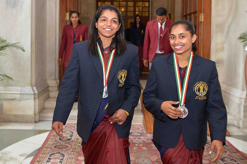 NEW DELHI, AUG 29 (UNI)- Olympions wrestler Sakshi Malik (L) and Gymnast Dipa Karmakar after receiving Rajiv Gandhi Khel Ratna Awards dureing a glittering award ceremony, at Rashtrapati Bhavan, in New Delhi on Monday. UNI PHOTO-52U