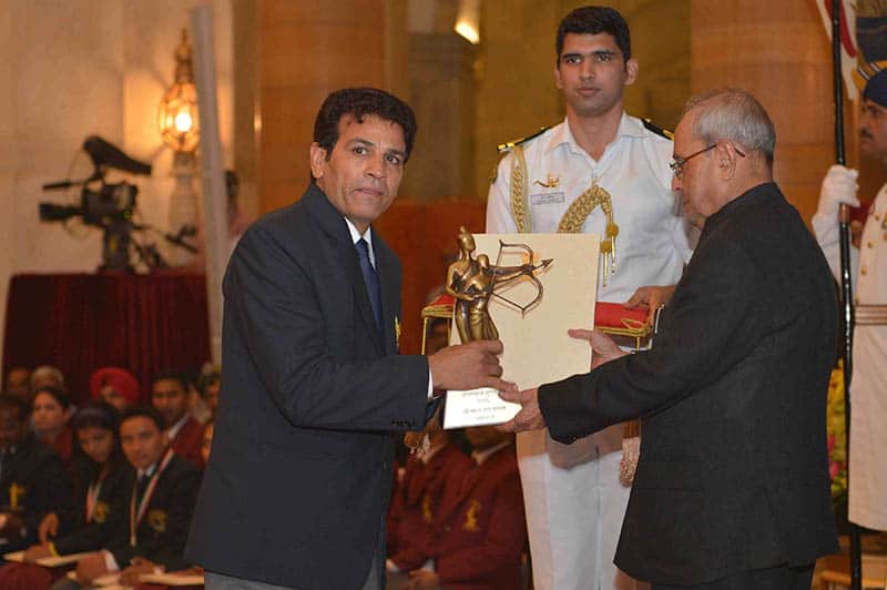 NEW DELHI, AUG 29 (UNI)- President Pranab Mukherjee presenting Dronacharya award to Boxing Coach Sagarman Dhayal during Sports and Adventure Award 2016 ceremony, at Rashtrapati Bhavan, in New Delhi on Monday. UNI PHOTO-54U
