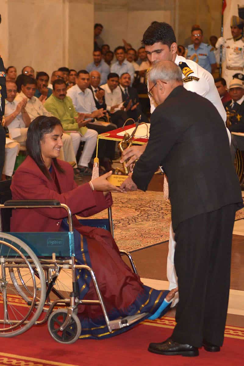 NEW DELHI, AUG 29 (UNI)- President Pranab Mukherjee presenting Rajiv Gandhi Khel Ratna Award to Dipa Karmakar for Gymnastics during award ceremony, at Rashtrapati Bhavan, in New Delhi on Monday. UNI PHOTO-47U