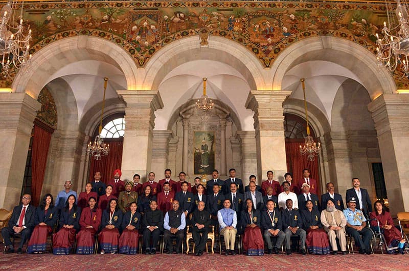 President Pranab Mukherjee with awardees pose fro a group photograph, during Sports and Adventure Award 2016 ceremony, at Rashtrapati Bhavan, in New Delhi on Monday. UNI PHOTO