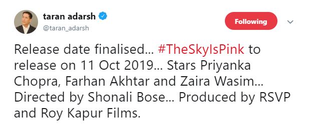 He wrote, “Release date finalised… #TheSkyIsPink to release on 11 Oct 2019… Stars Priyanka Chopra, Farhan Akhtar and Zaira Wasim… Directed by Shonali Bose… Produced by RSVP and Roy Kapur Films.”