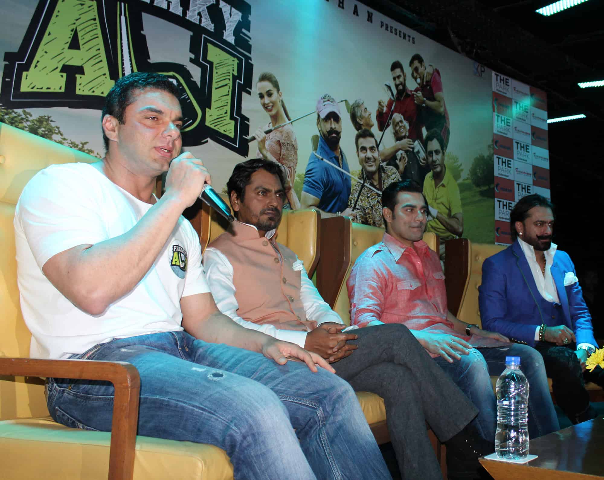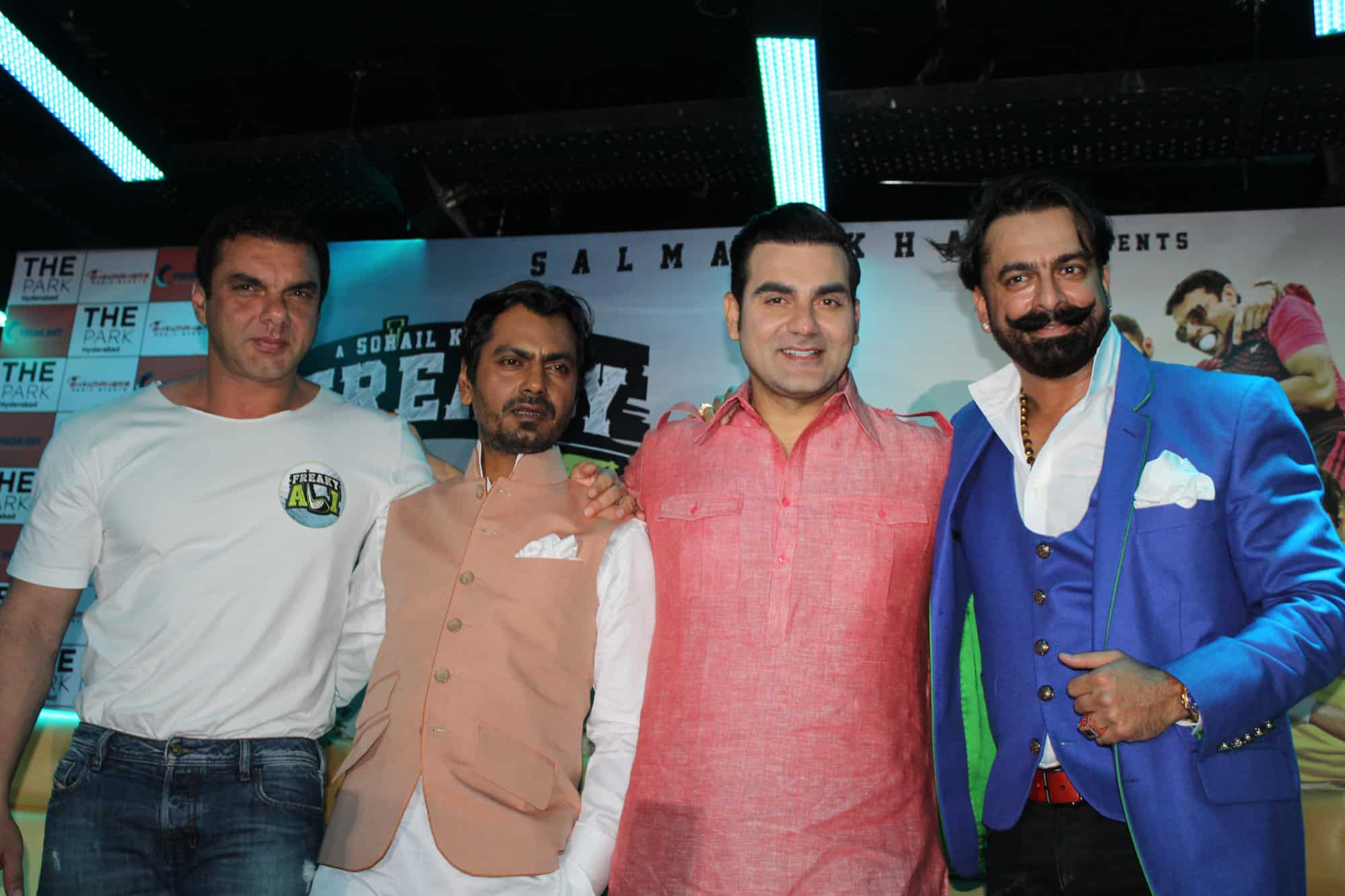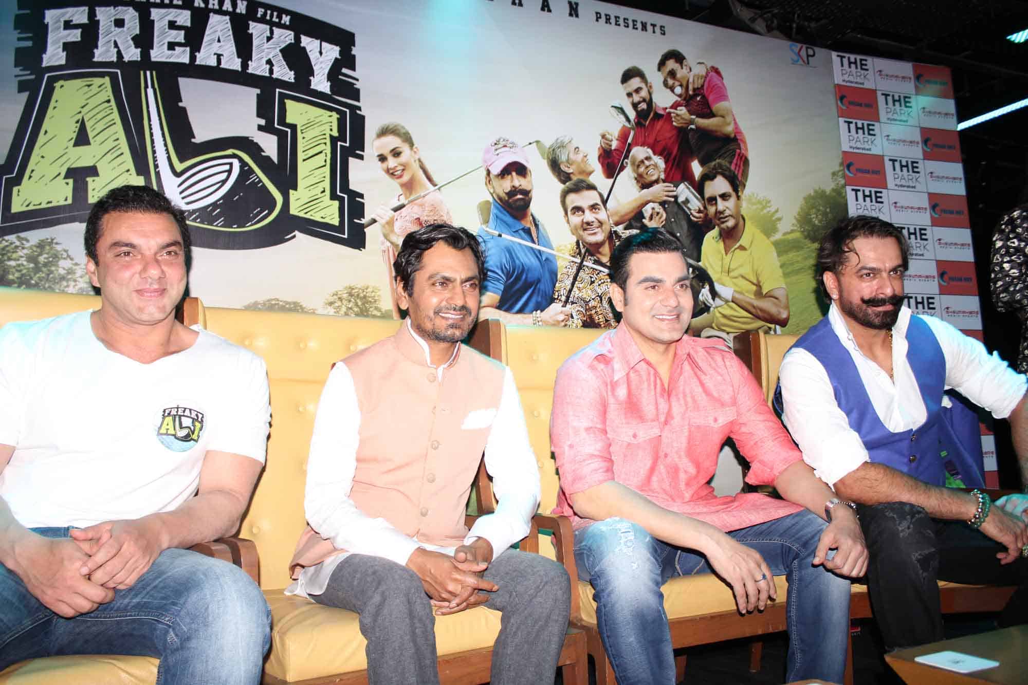 Bollywood celebrities Arbaaz Khan, Sohail Khan, Nawaz Uddin Siddiqui, Jaaz Arora seen together at Hotel Park Hayath in Hyderabad during promotion of Freaky Ali on Friday. (Photo: Zabi)