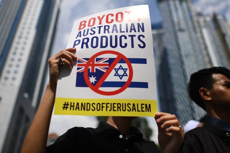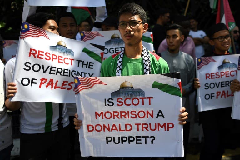 A group of Muslim demonstrators carrying Palestinian flags rally outside the Australian embassy in Kuala Lumpur following a Friday prayer on December 21, 2018 to protest against Australia’s decision to recognize West Jerusalem as the capital of Israel.