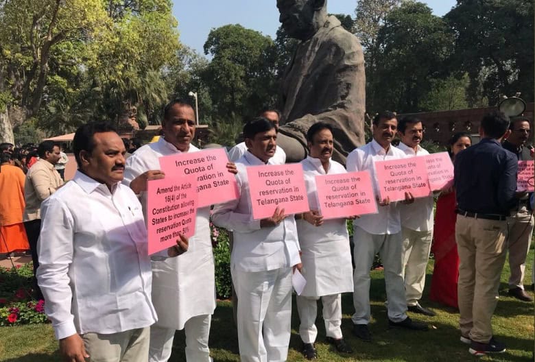 TRS, MPs upped the ante in the Lok Sabha demanding amendments to the Ninth Schedule of the Constitution empowering the States to increase reservation for weaker sections even as Chief Minister K Chandrashekhar Rao’s call for a Third Front became the hot topic of discussion in Parliament. The TRS MPs stalled the proceedings in the Lok Sabha after Speaker Sumitra Mahajan rejected their adjournment motion in this regard. They were joined by TDP MPs from Andhra Pradesh who raised the Special Category Status issue, forcing the Speaker to adjourn the session till Tuesday. TRS floor leader in Lok Sabha, AP Jithender Reddy, Smt Kavitha Kalvakuntala, Sri Bhora Narasiah Goud, Sri B Suman, Sri B Vinod Kumar and others can be seen during protest at Parliament on Tuesday