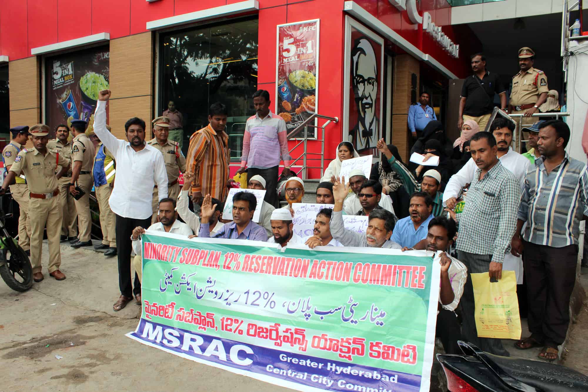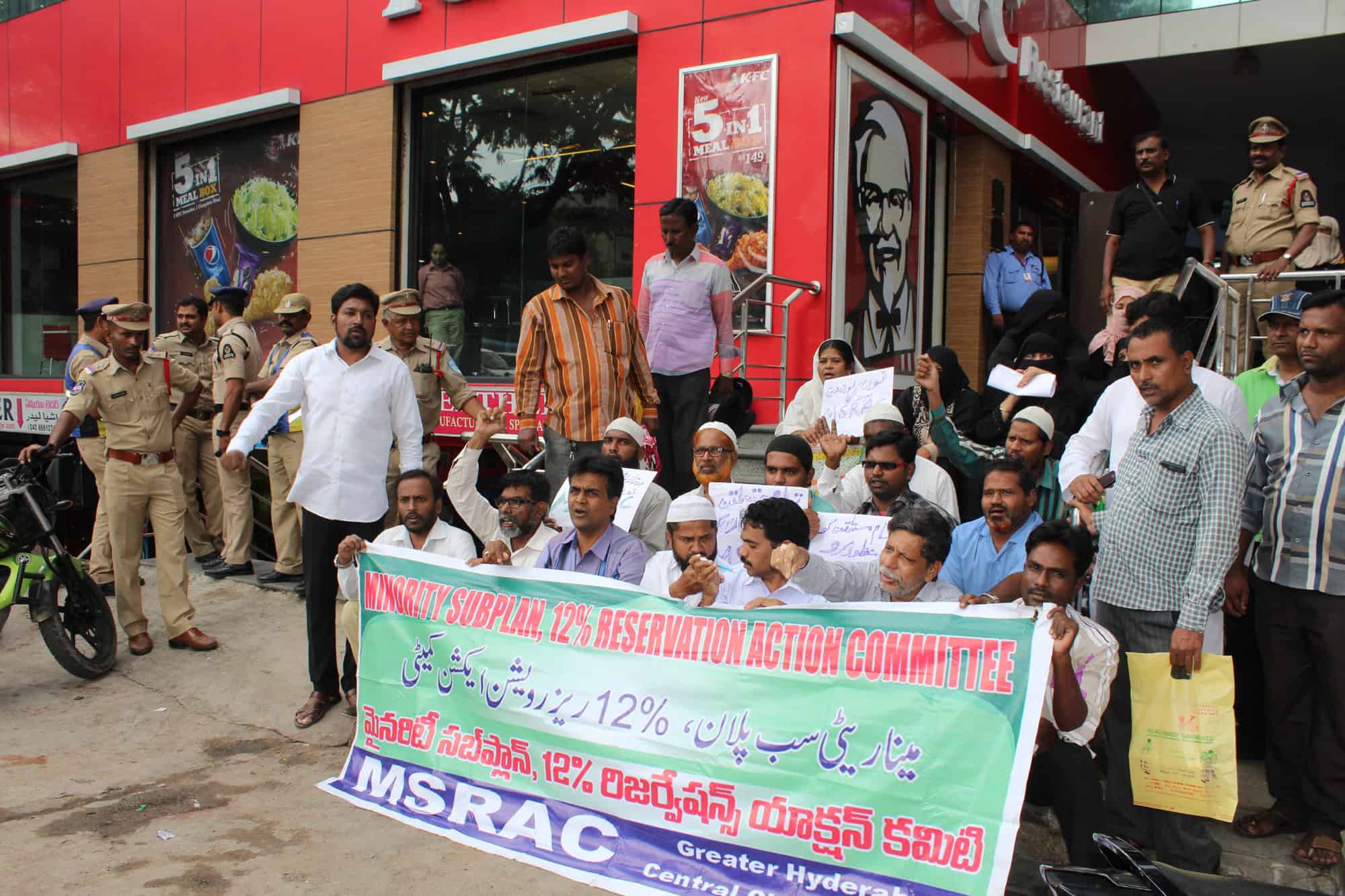 Minority sub plan and 12% Reservation action committee organized a protest demonstration at Minority Finance Corporation Telangana State office abids. Committee leaders Shaik Abudl Sattar, Mohammed Abbas and others along with burqa clad women seen during protest. (Photo: Zabi)