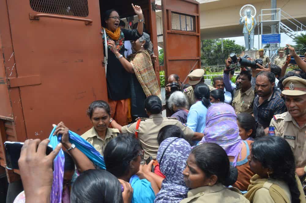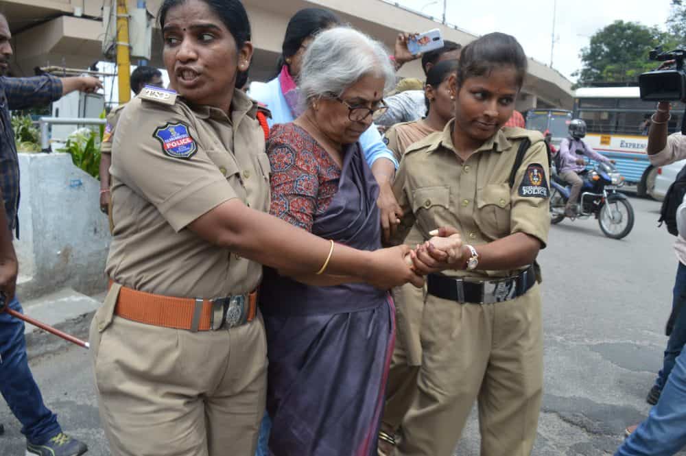 Hyderabad Police on Wednesday detained around a dozen activists after they staged a dharna at Ambedkar Junction in the city. The agitation was held after a team of Pune Police raided the house of Left ideologue Varavara Rao and his relatives on Tuesday. The 81-year-old activist who was arrested was later produced before the Nampally Court and taken to Pune on a transit remand. Meanwhile, the rights activists have criticized the arrests of activists and alleged that the Central government is trying to muzzle opposition voices. (Photo- Zabi)