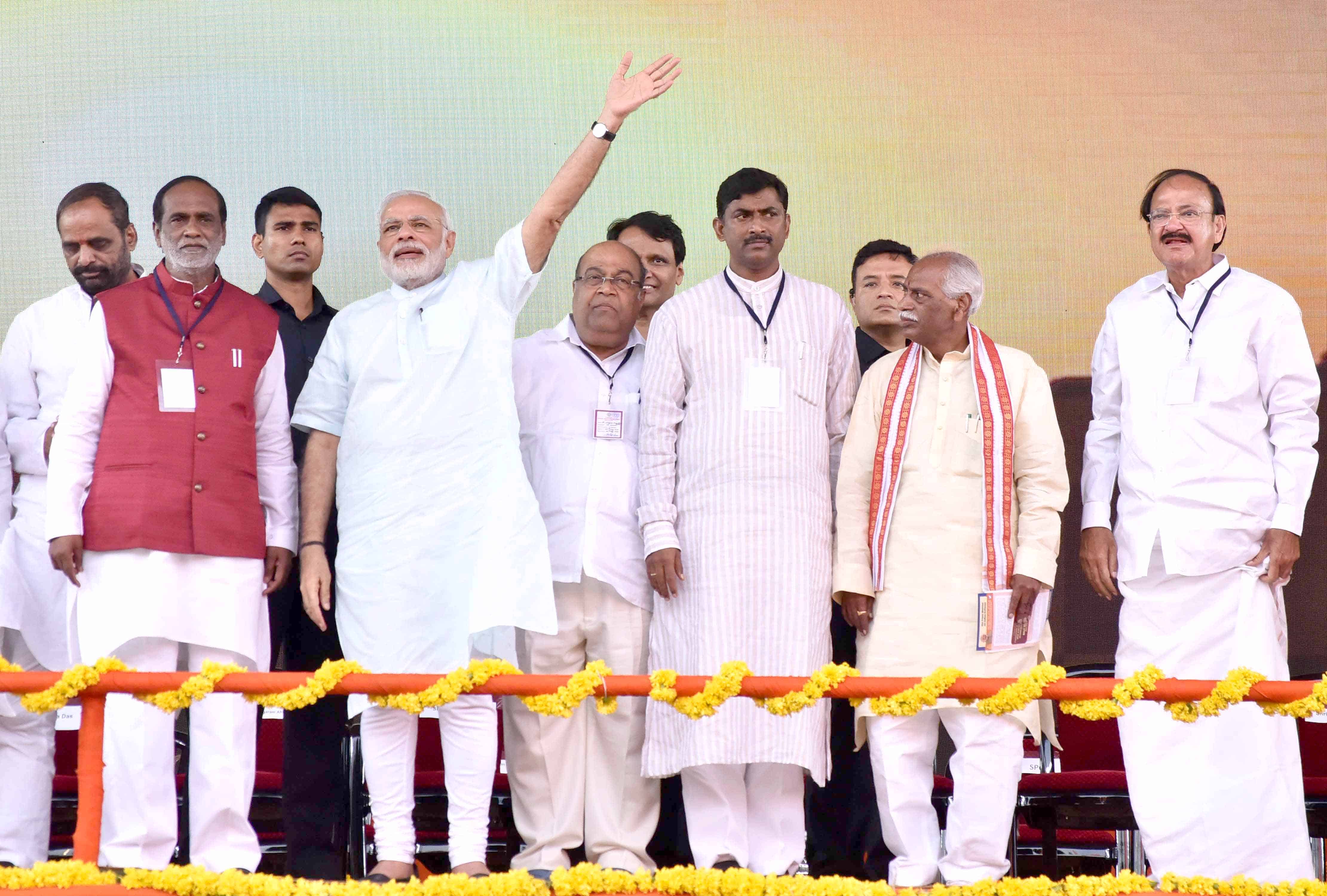 Prime Minister of India Narendra Damodardas Modi along with other party leaders M.Venkaiah Naidu, Bandarudattriya and others responds to the crowed at public meeting at LB stadium in Hyderabad