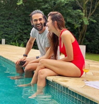 In his new Instagram post, Kriti sizzles in a bright red monikini that offsets the pristine blue water of the pool. Pulkit is in grey T-shirt and shorts.