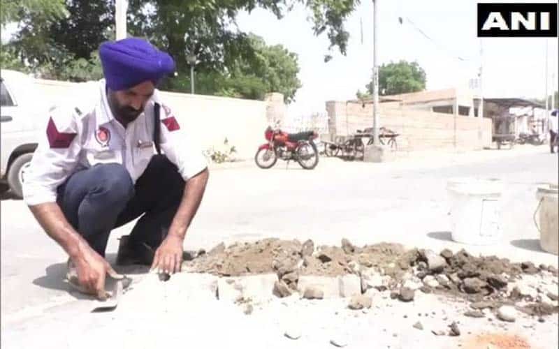 Bhatinda: Apart from regulating traffic, traffic police personnel Gurbkhs Singh here fills up potholes on roads for the ease of commuters.