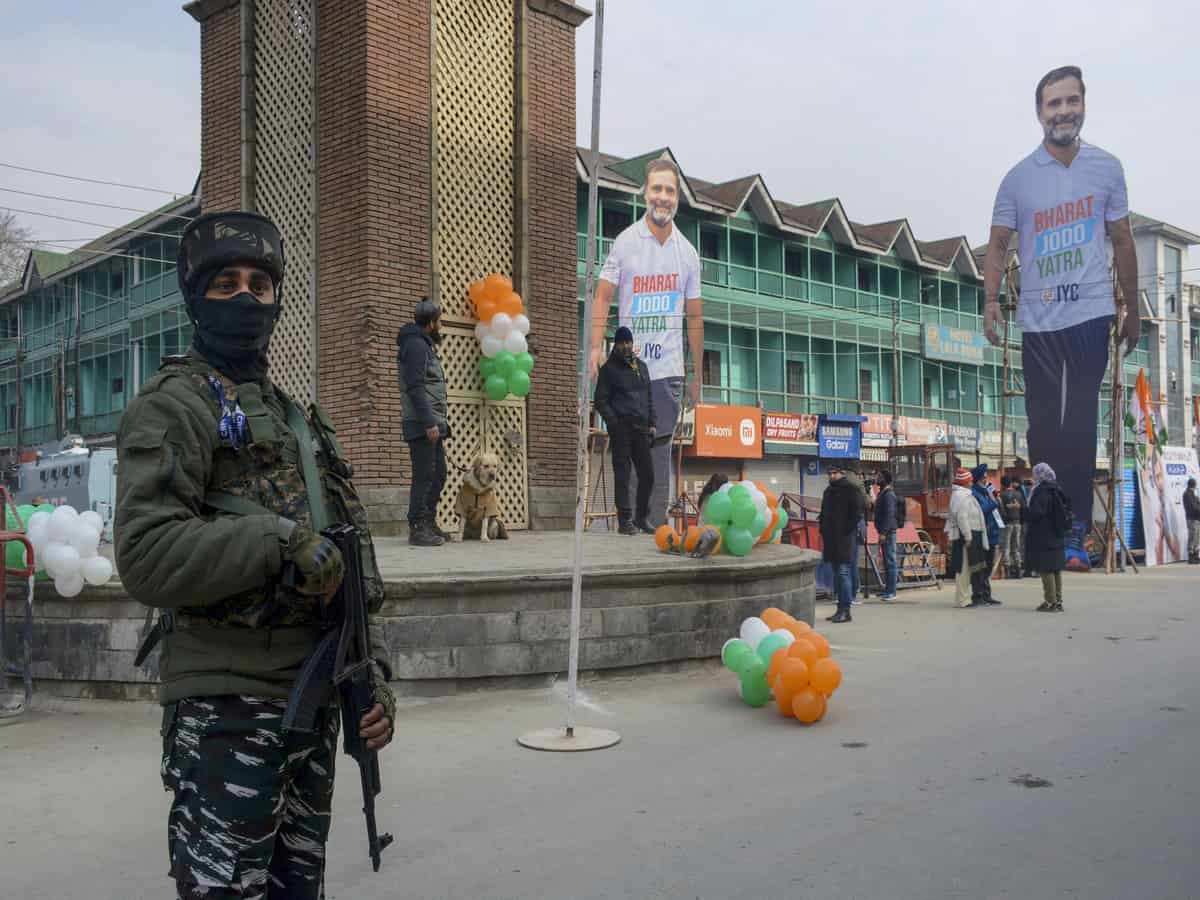 Srinagar: Congress leader Rahul Gandhi on Sunday unfurled the national flag at the historic clock tower of Lal Chowk here as part of the ‘Bharat Jodo Yatra’, amid stringent security measures usually reserved for a prime ministerial visit.