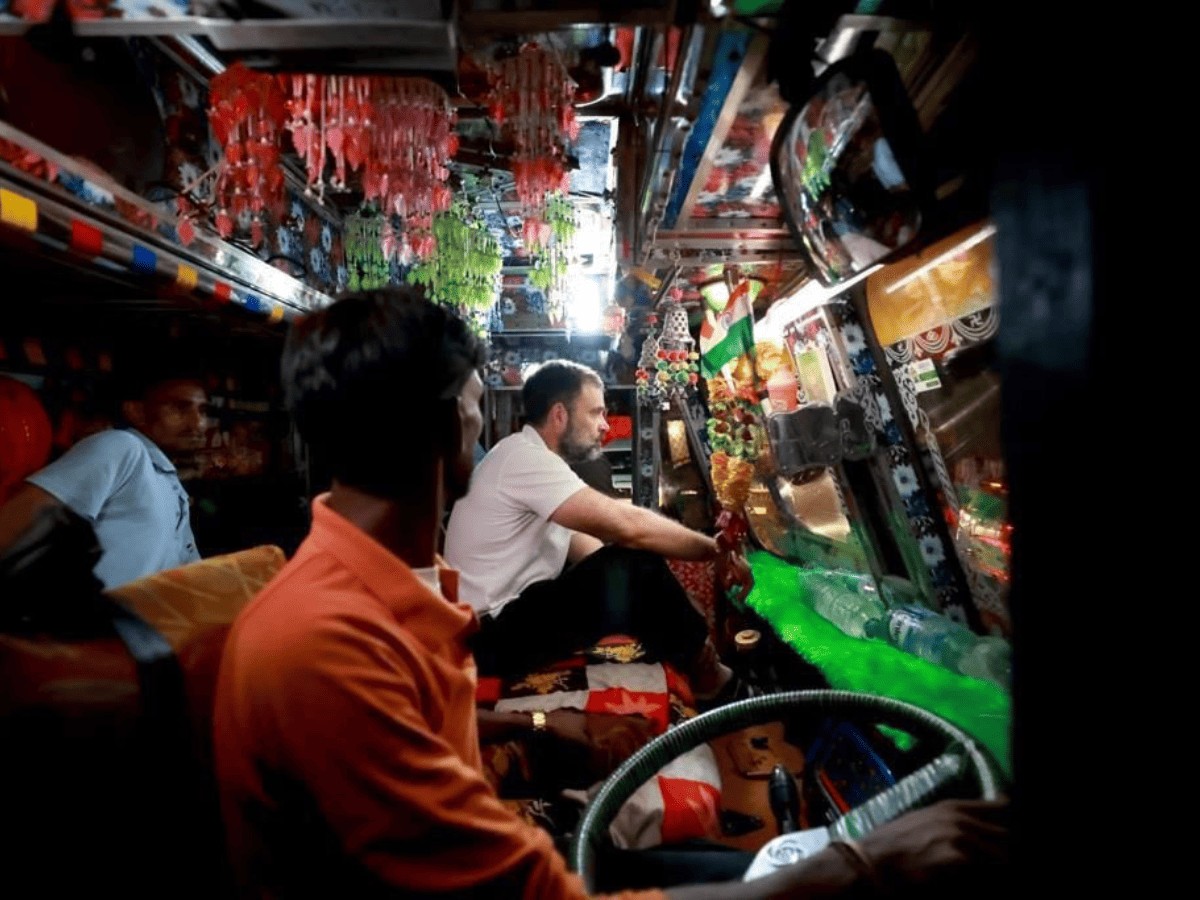 Gandhi undertook the journey Monday night and in visuals and videos, the former Congress chief, donning his trademark white T-shirt, is seen sitting inside a truck, travelling with a driver and speaking to drivers at a dhaba.