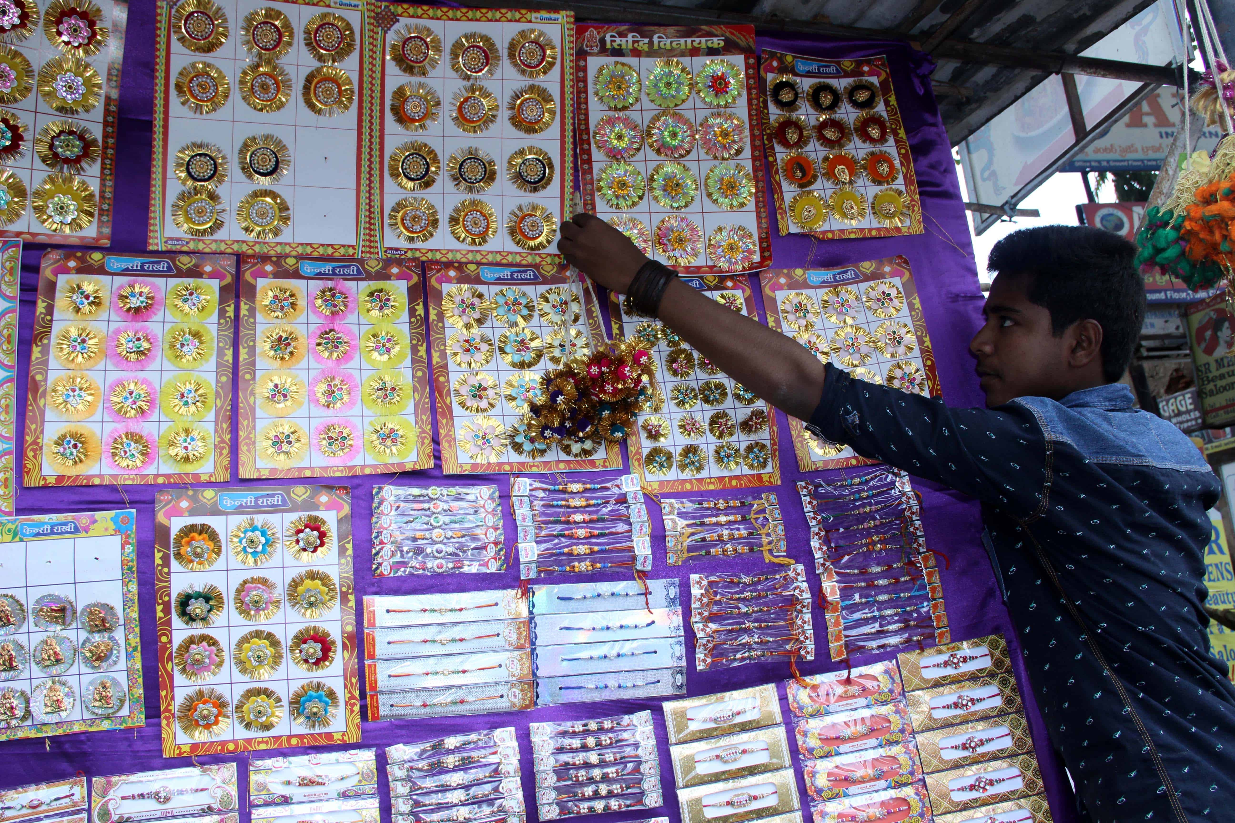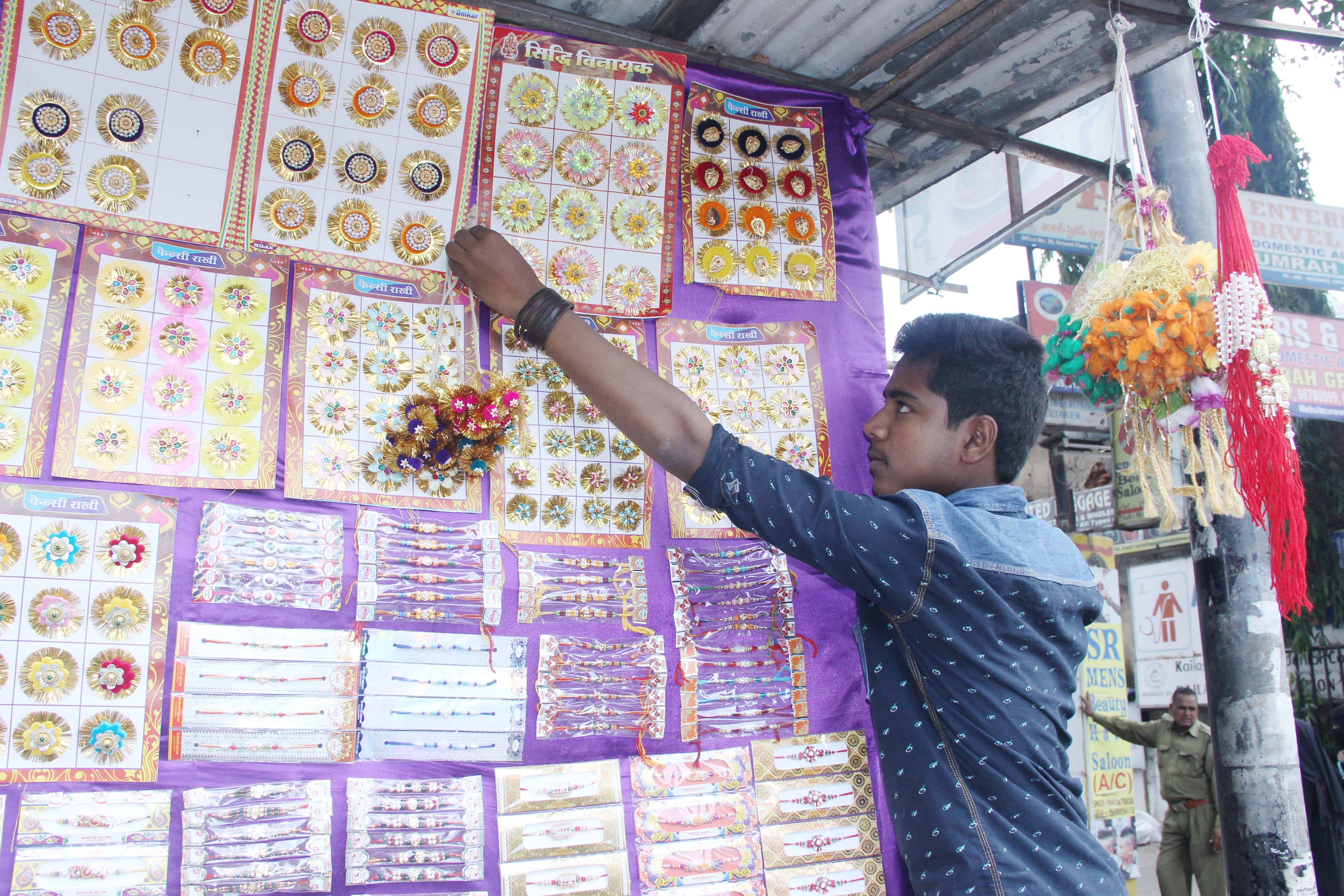 A rakhi seller is busy decorating his outlet with varieties of rachis in the city ahead of Raksha Bandhan Festival. Photo:Laeeq