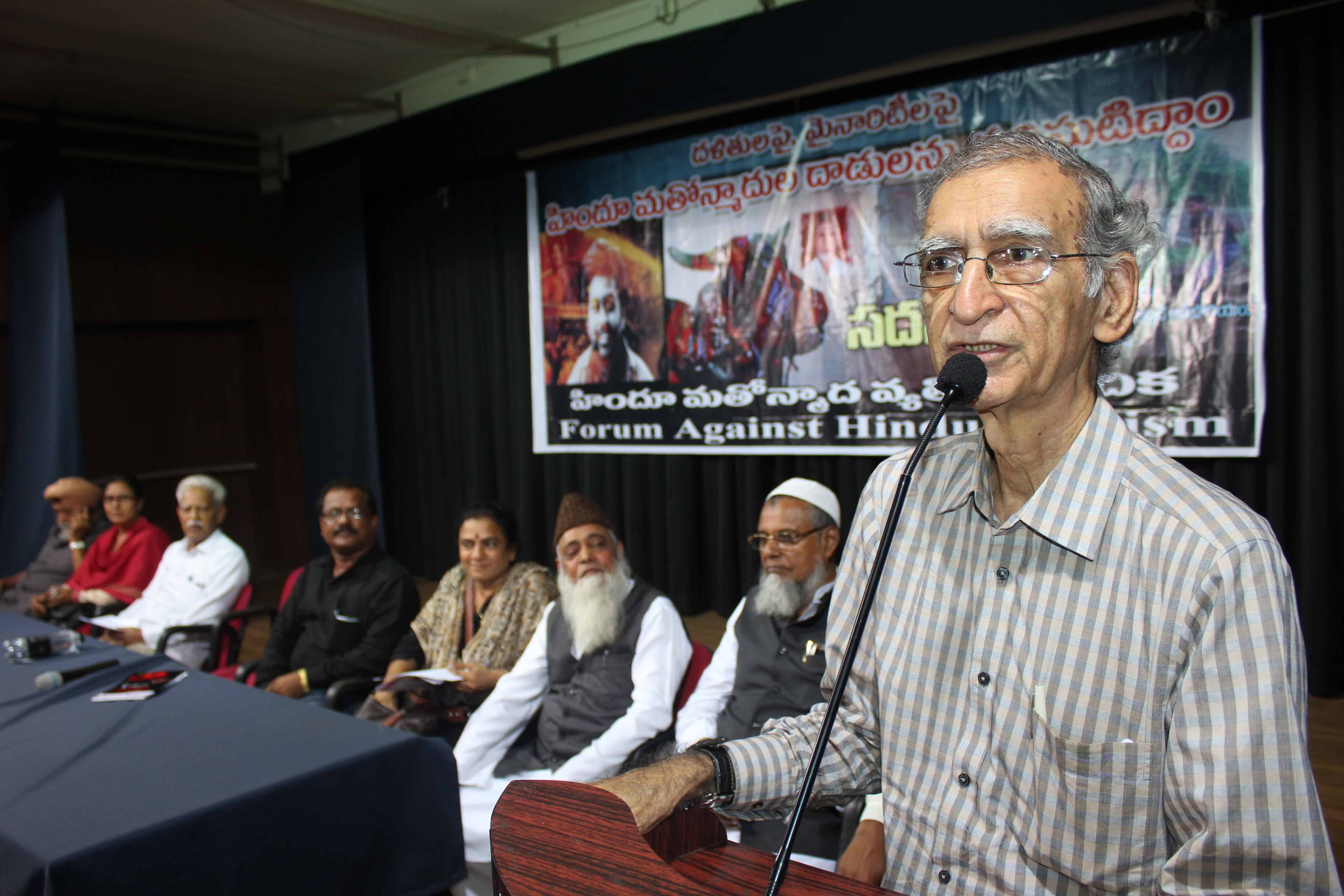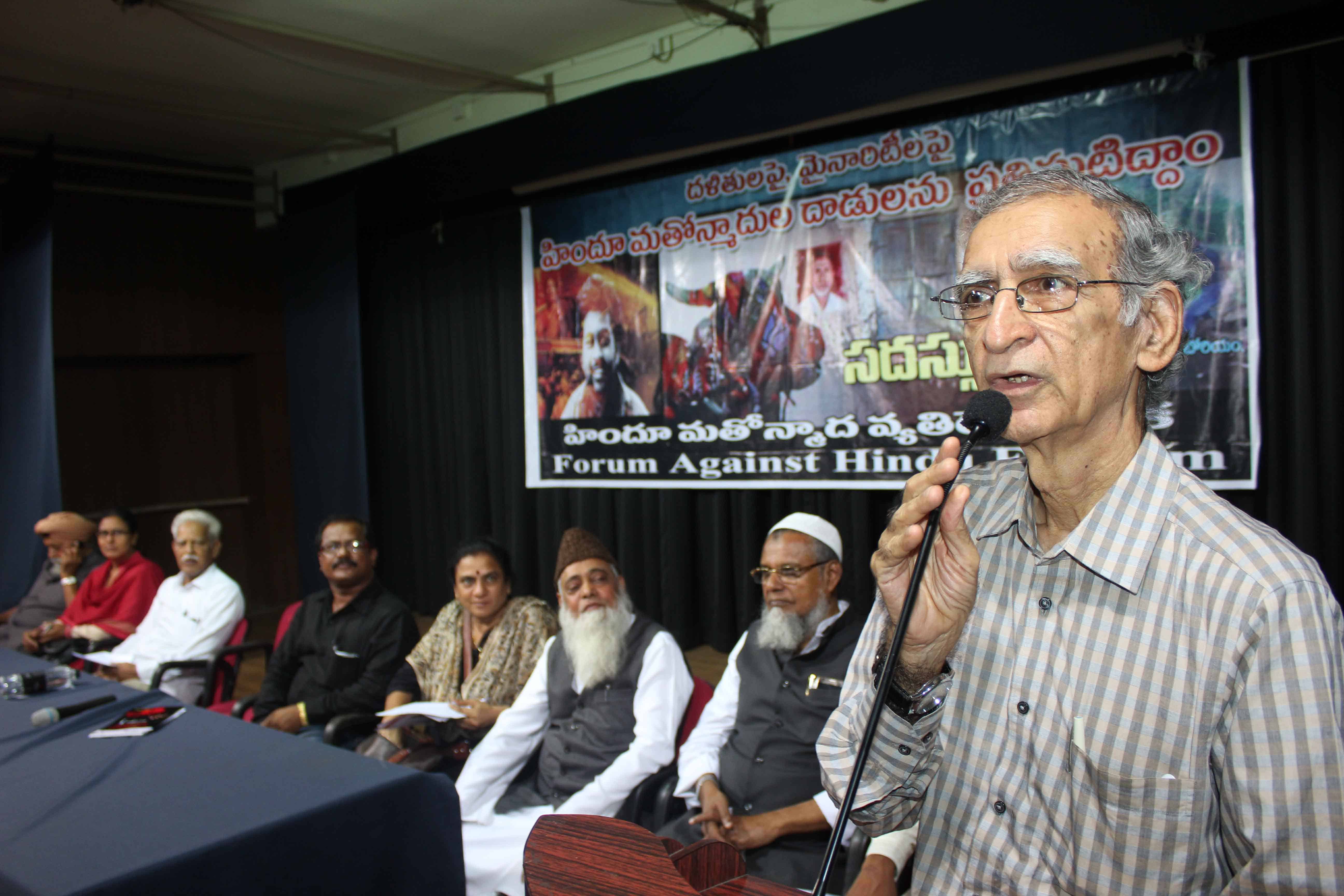 Addressing a public meeting organized by Anti-Hindu Fascism Forum yesterday, noted author and social activist Mr. Ram Punyani stressed the need for creating awareness against Hindu fascism. These days, atrocities on Dalits and Muslims have increased. It is therefore the need of the hour is for the Muslims and Dalits to get united. He was addressing a public meeting yesterday at Telugu university auditorium. Continuing his speech, Mr. Ram Punyani said that with the increasing incidents of intolerance, it has been proved that Hindu fascist forces are making an attempt to target Dalits and Minorities in the name of religion. Despite spending crores of rupees, BJP got only 31% votes. This party is supporting Hindu fascism. (Photo: Zabi)