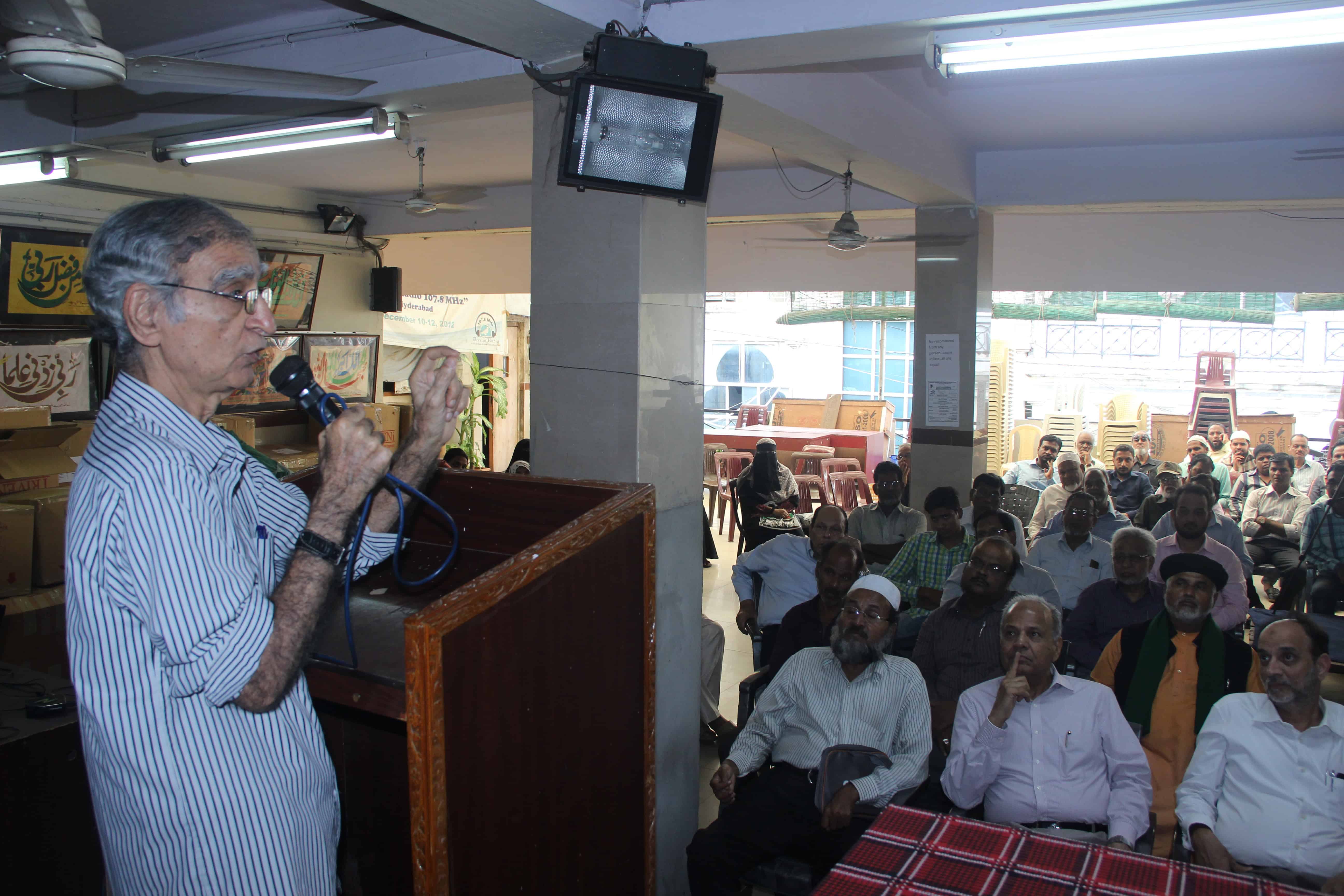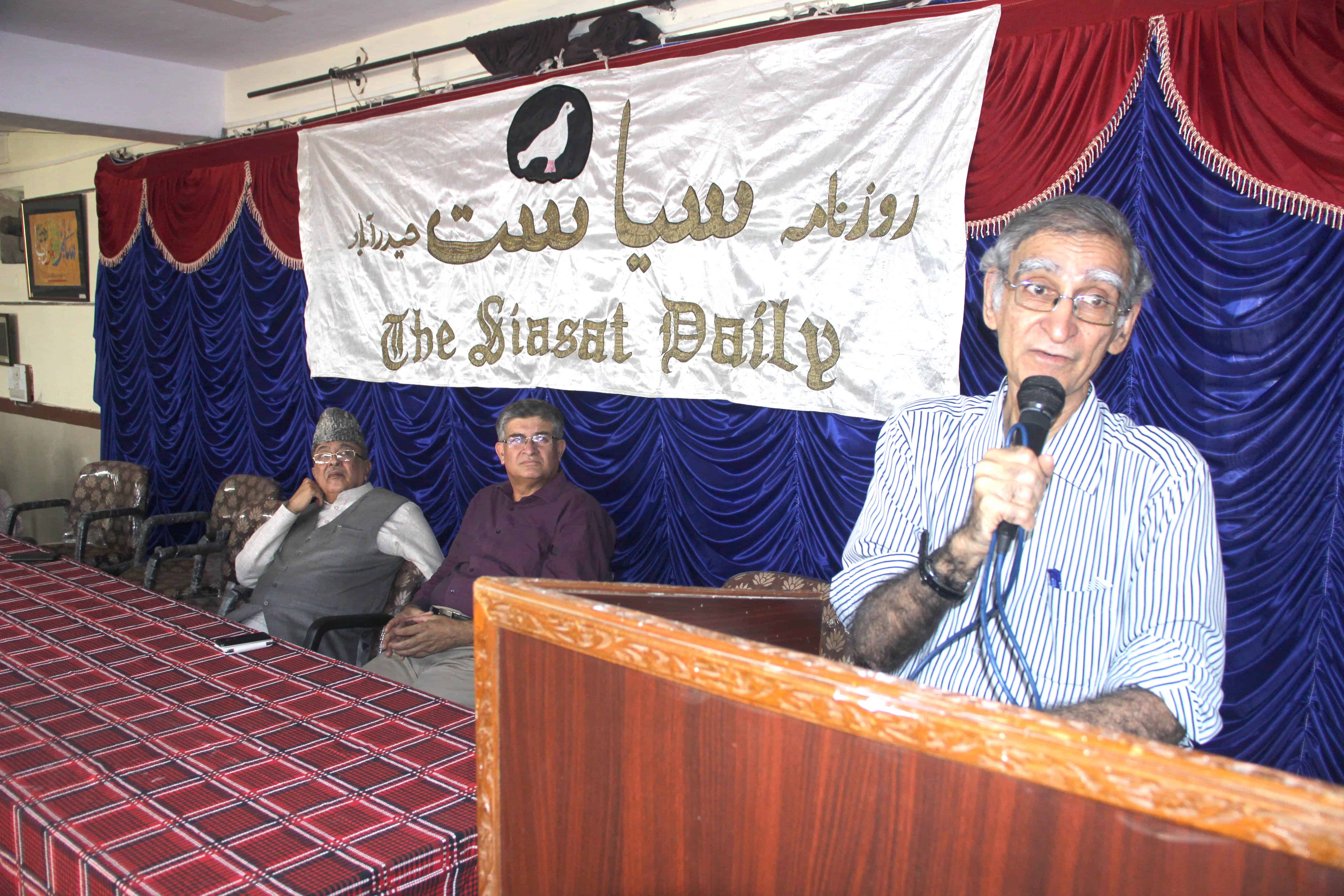 Noted social activist, Mr. Ram Punyani delivered a lecture on “Atrocities on Dalits and Minorities in Democratic India dangerous” on Tuesday at Mahboob Husain Jigar Hall, Siasat Office Complex, Abids, Hyderabad. Mr. Zahid Ali Khan, Editor Siasat and Mr. Adil Mohammad, Swaraj Abhiyan Peace Committee were also among the speakers. (Pic. Laeeq)