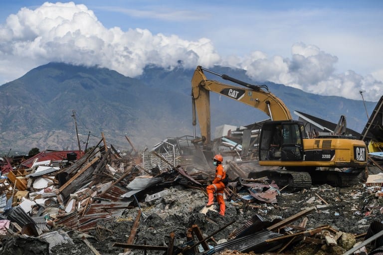 An Indonesian search and rescue team uses heavy equipment to recover bodies from the debris in Petobo in Central Sulawesi on October 8, 2018, following the September 28 earthquake and tsunami.