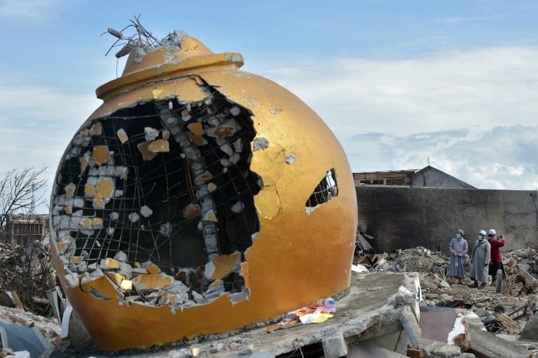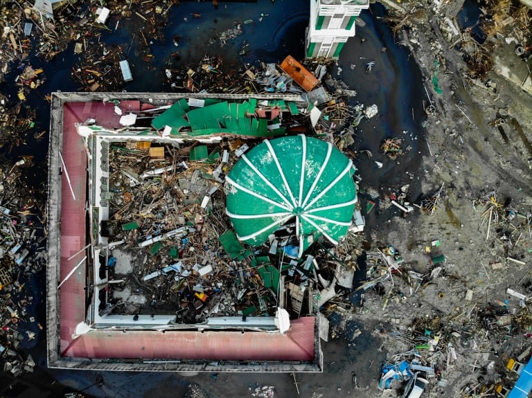 This aerial image shows the collapsed Baiturrahman Grand Mosque in Palu in Indonesia’s Central Sulawesi on October 3, 2018, after an earthquake and tsunami hit the area on September 28.