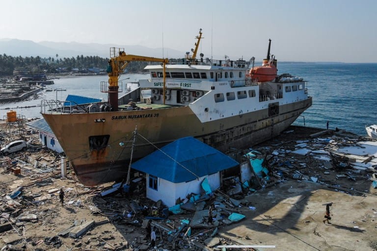 Residents and rescuers walk in front of a washed out passenger ferry in Wani, Indonesia’s Central Sulawesi on October 7, 2018, following the September 28 earthquake and tsunami. Aid poured into disaster-ravaged Palu after days of delays as efforts ramped up to reach 200,000 people in desperate need following a deadly quake-tsunami in the Indonesian city.