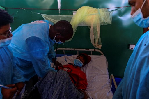 In this photograph doctors from Médecins Sans Frontières (MSF) examine a Rohingya Muslim refugee infected with diphtheria at the MSF field hospital in the Bangladeshi town of Thankhali.AFP