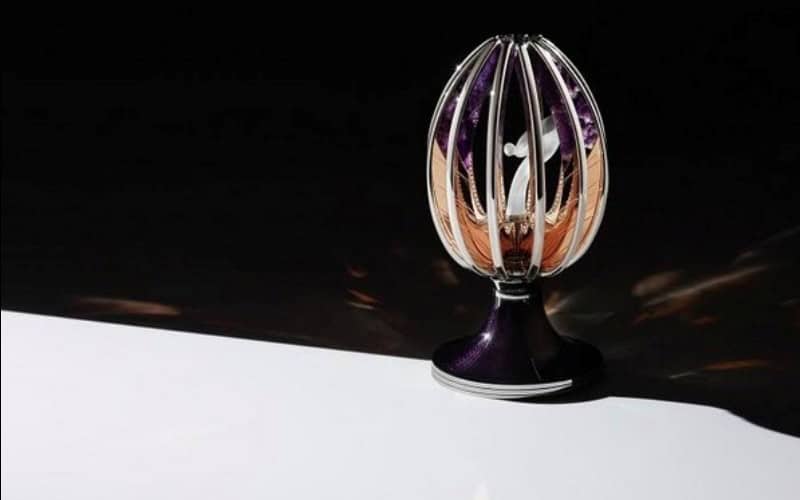 The Egg rests on an engine-turned, hand-engraved, purple enamel guilloche base of 18 karat white gold. Arms of rose gold define the shape of the egg, acting as a protective chamber for the Egg’s precious inhabitant.