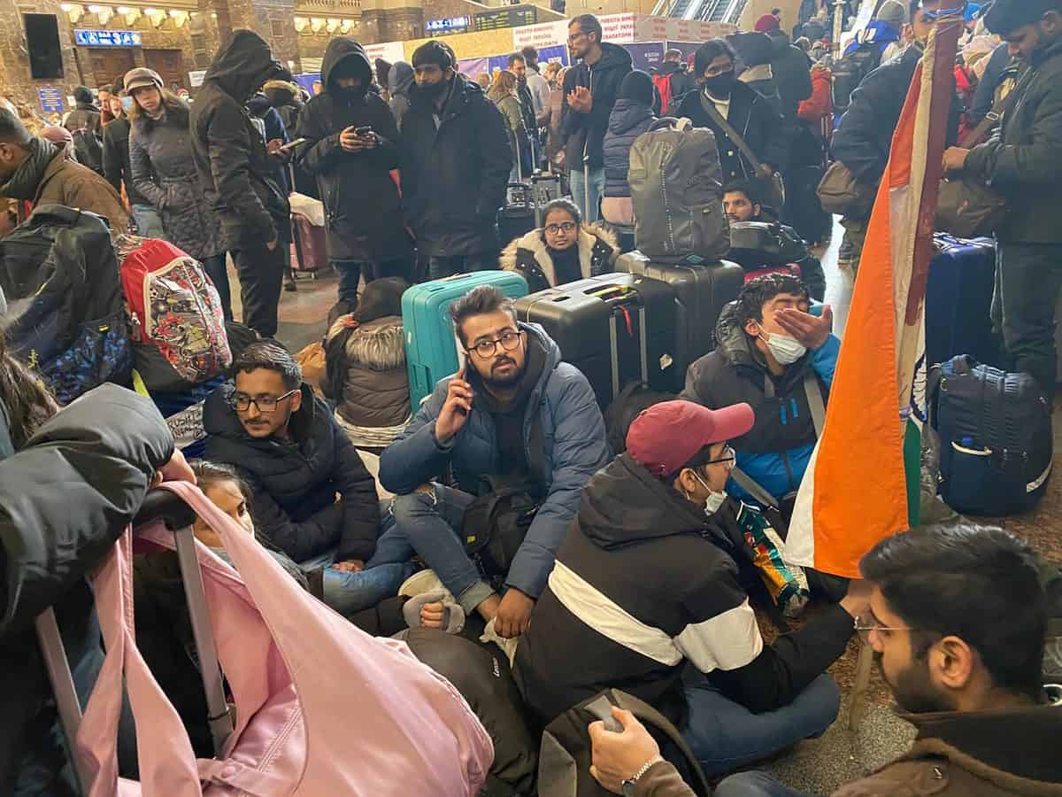 Ukraine: Indian students stranded in Ukraine sit at a railway station after being denied permission to board trains by local police, amid Russia-Ukraine conflict, in Ukraine, Monday, Feb. 28, 2022. (PTI Photo)