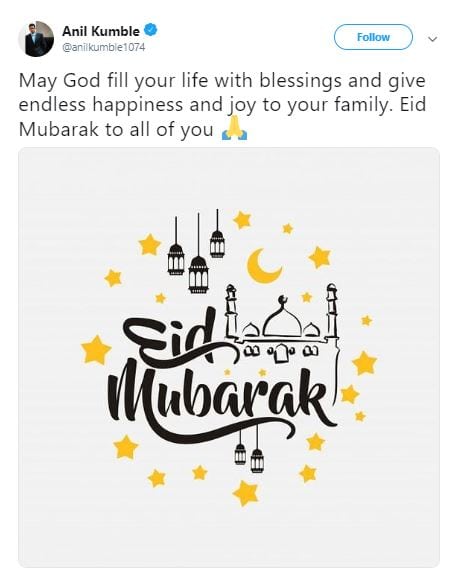 Kumble tweeted: “May God fill your life with blessings and give endless happiness and joy to your family. Eid Mubarak to all of you.”