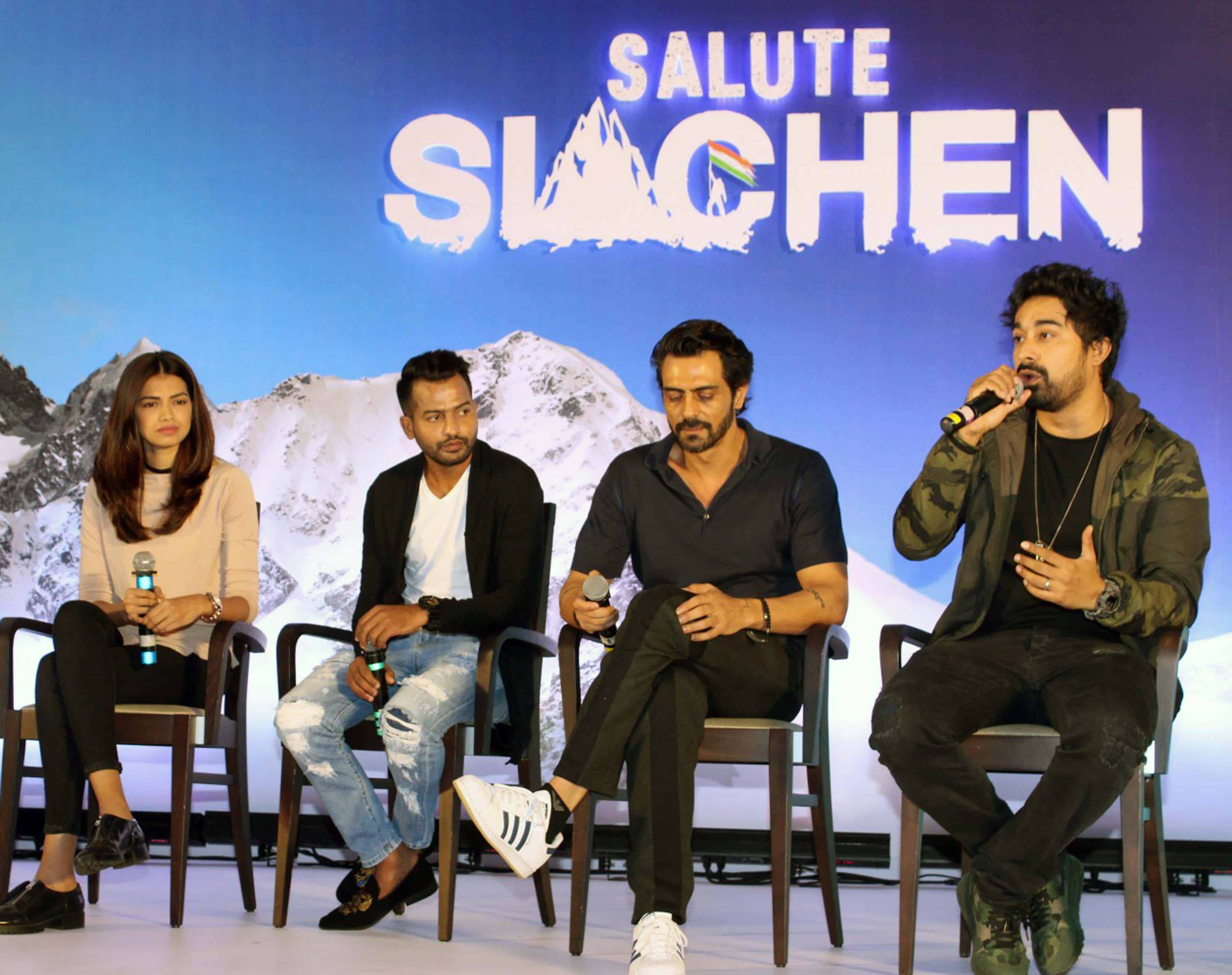 Model Namratha Gujaran, Hockey player Yuvraj Walmiki, Bollywood actor Arjun Rampal, television actor Rannvijay Singh during a special announcement of Salute Siachen, in Mumbai on Wednesday night. UNI PHOTO