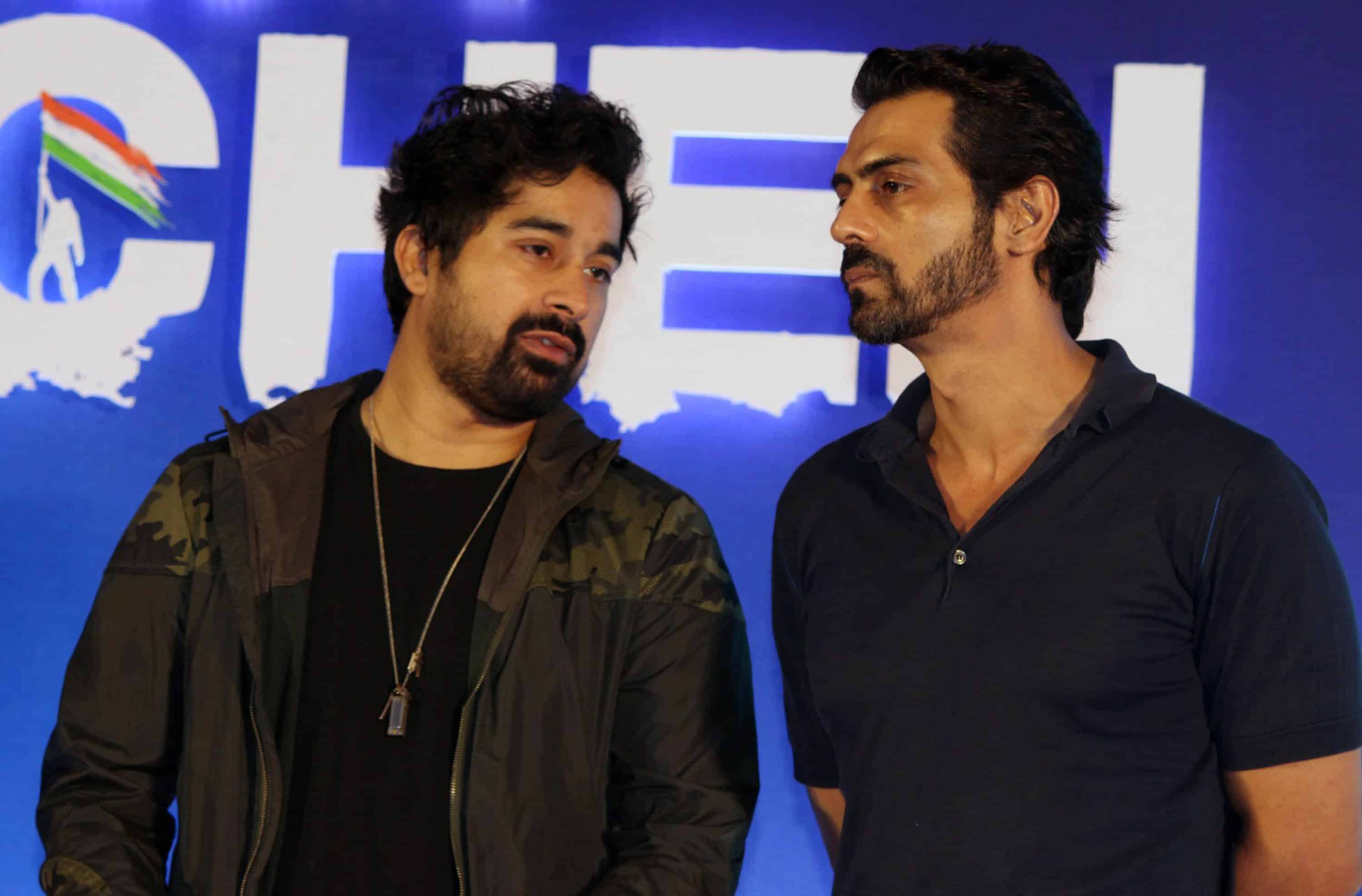 MUMBAI, AUG 11 (UNI):- Bollywood actor Arjun Rampal (R) and television actor Rannvijay Singh during a special announcement of Salute Siachen, in Mumbai on Wednesday night. UNI PHOTO -13u
