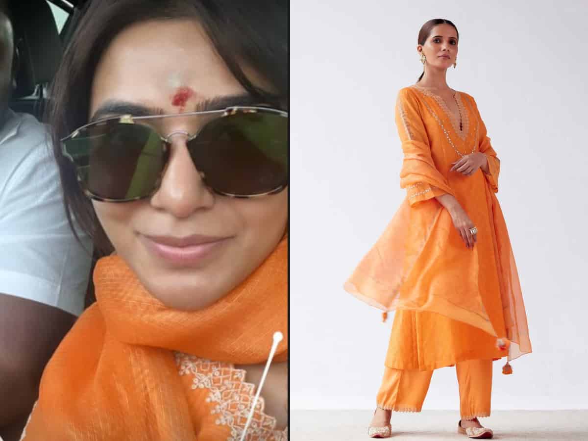 Samantha sought blessings at the renowned Golden Temple in Vellore during her sabbatical. On this spiritual journey, she was accompanied by Tamil film producer Jagadish Palanisamy. Samantha looked stunning in an Orange block print embroidered kurta set from the popular brand Devnaagri, which retails for around Rs. 21,500.