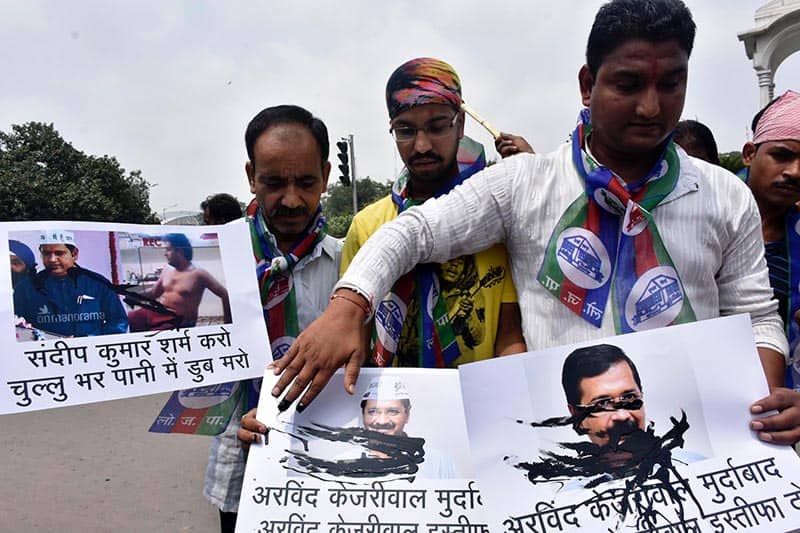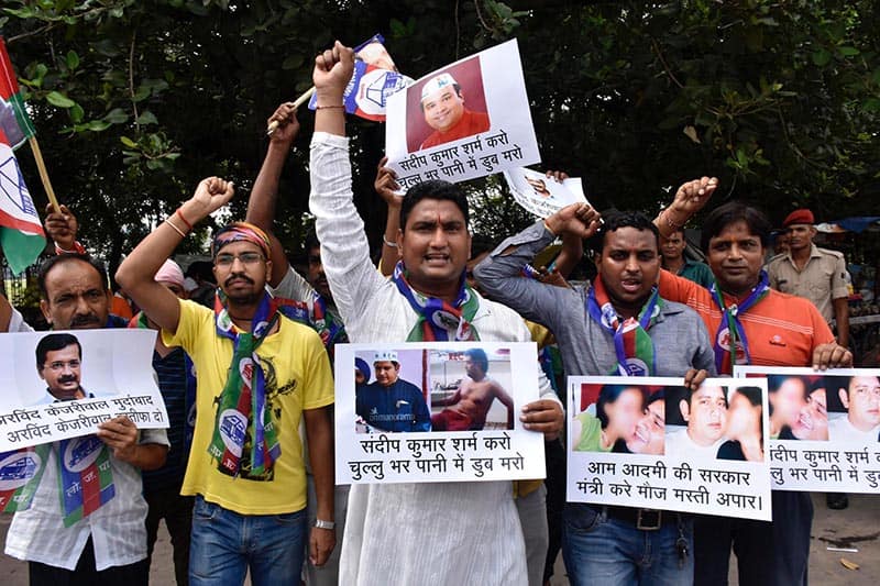 Activists shouting slogans against Delhi Chief Minister Arvind Kejriwal and his minister Sandeep Kumar, who involved sex scandal in Patna on Thursday.UNI PHOTO