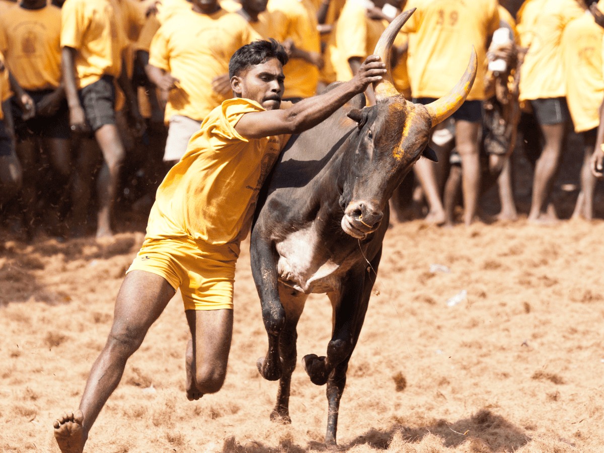“Jallikattu”, also known “eruthazhuvuthal”, is a bull-taming sport played in Tamil Nadu as part of the Pongal harvest festival.