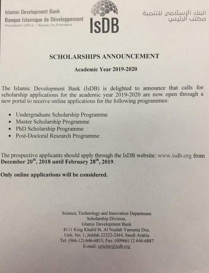 Jeddah [Saudi Arabia]: Islamic Development Bank (IsDB) invited scholarship applications from the interested and eligible candidate to pursue undergraduate, master, PhD, Post-Doctoral Research courses.