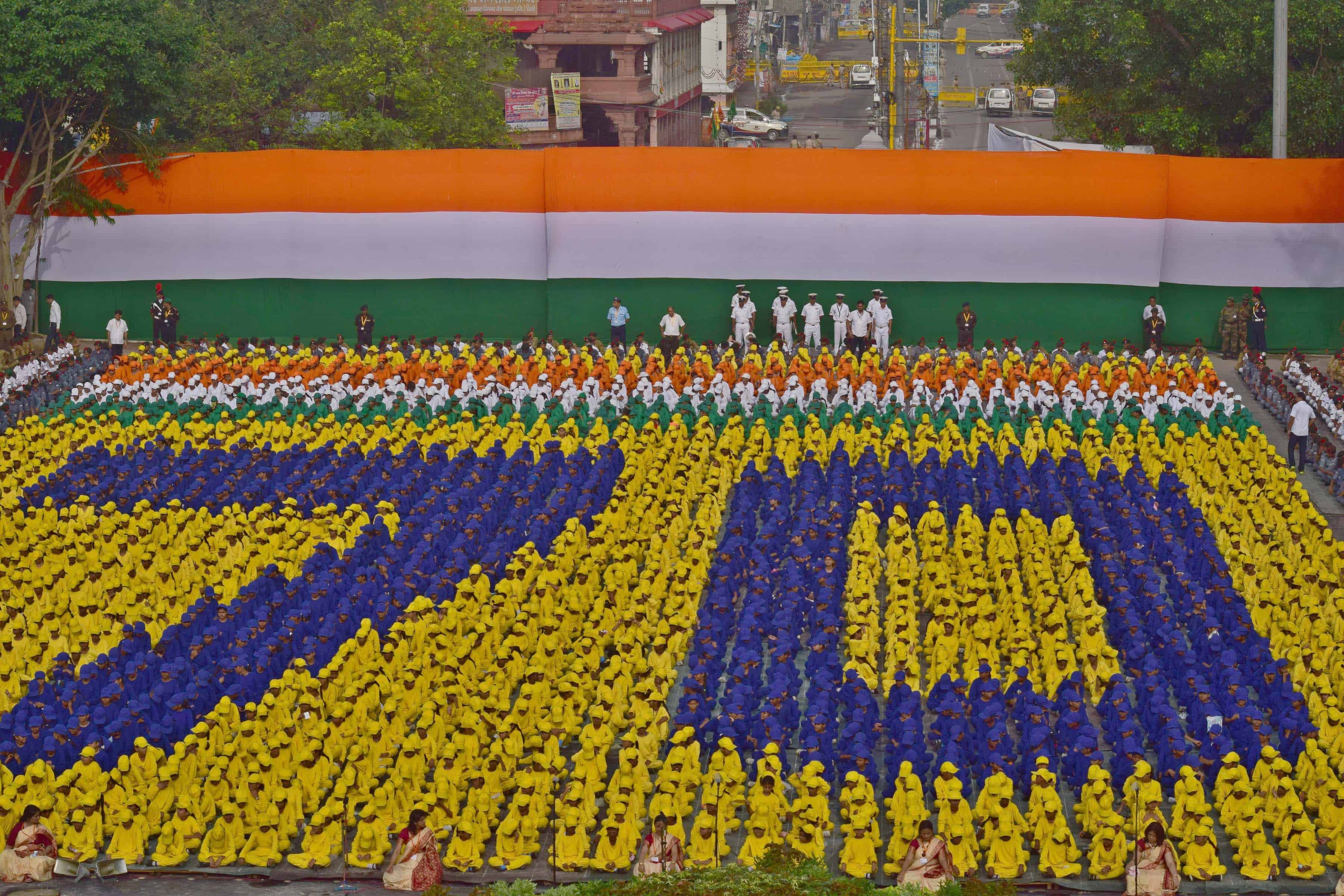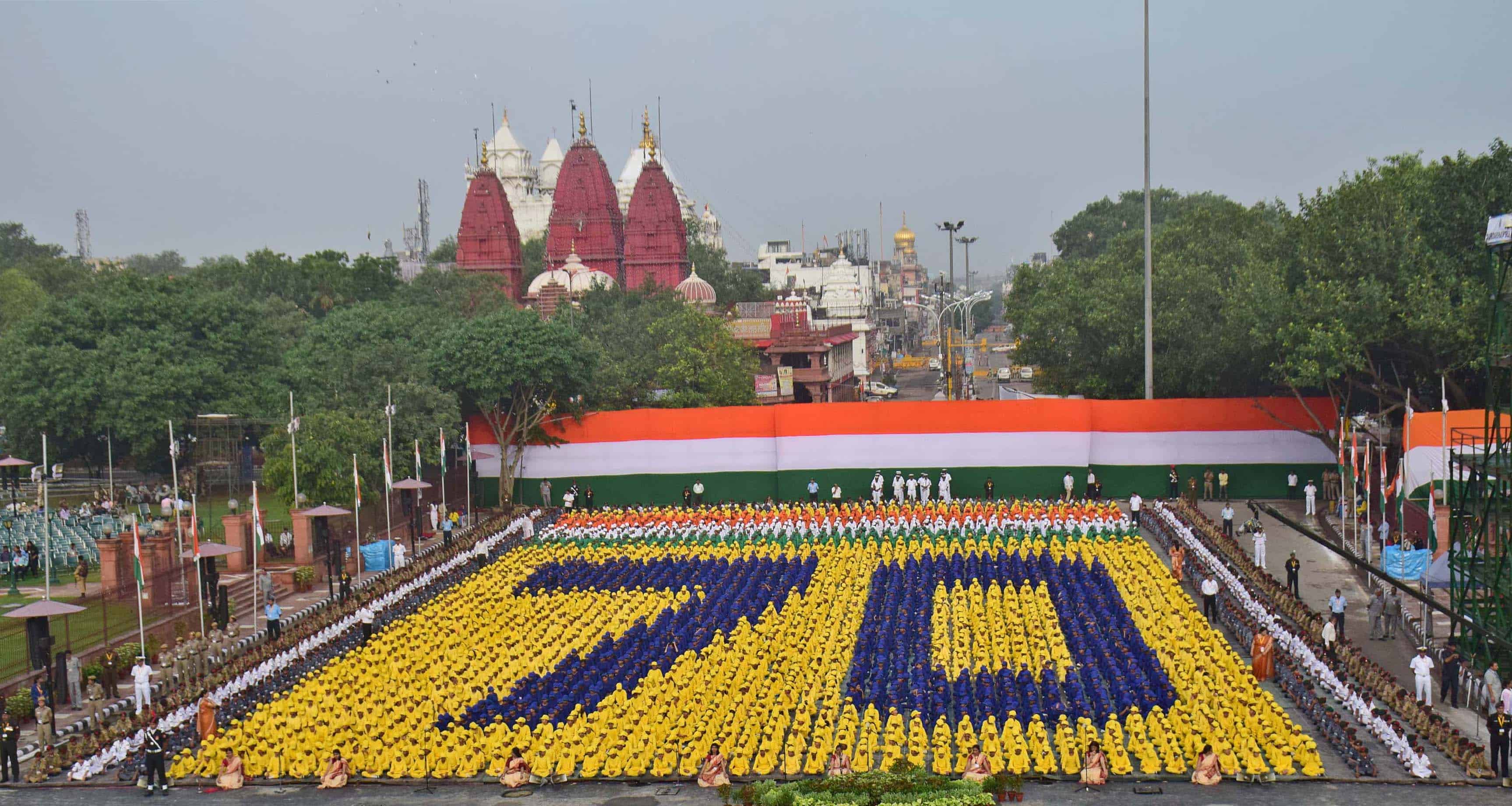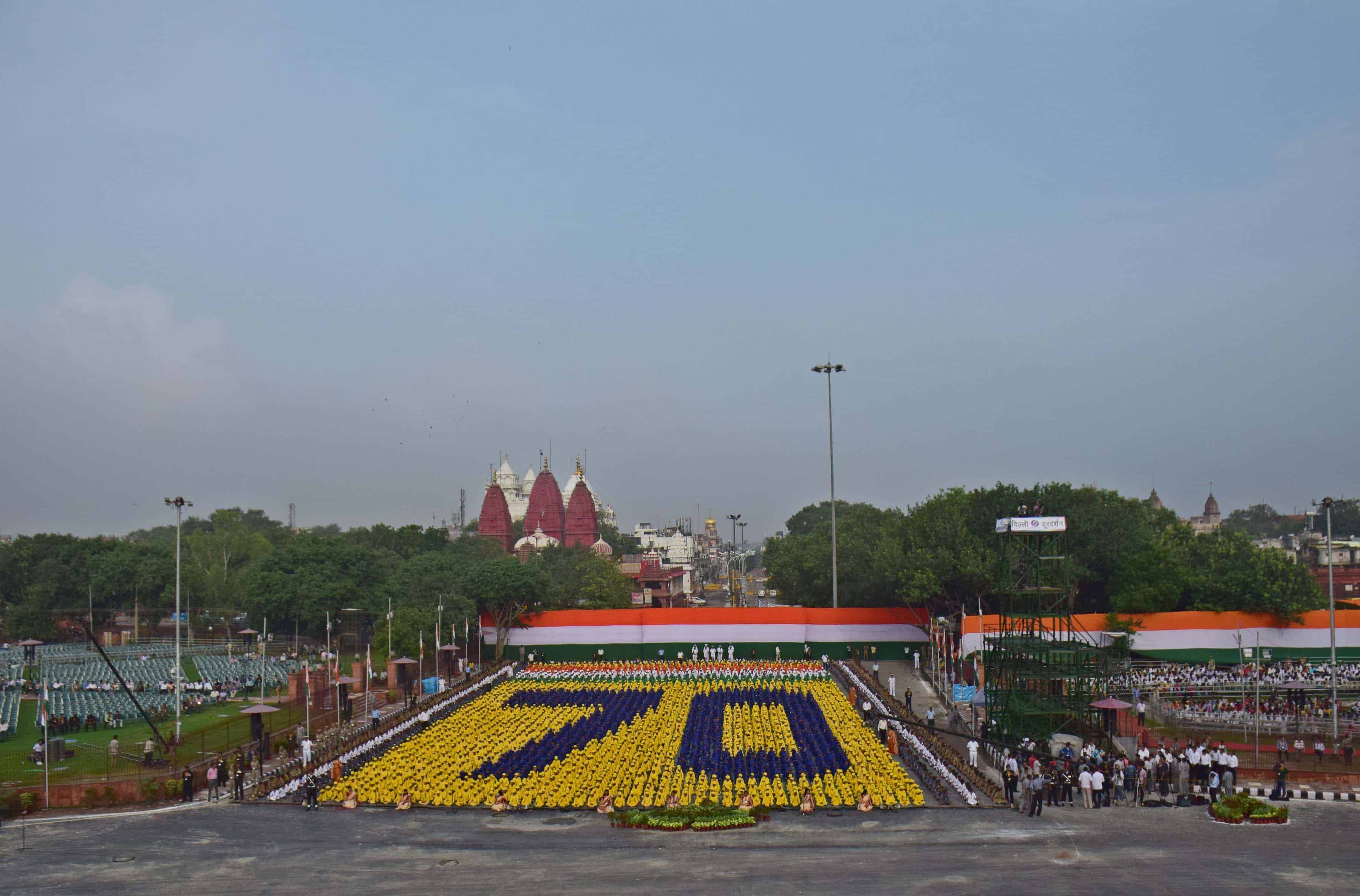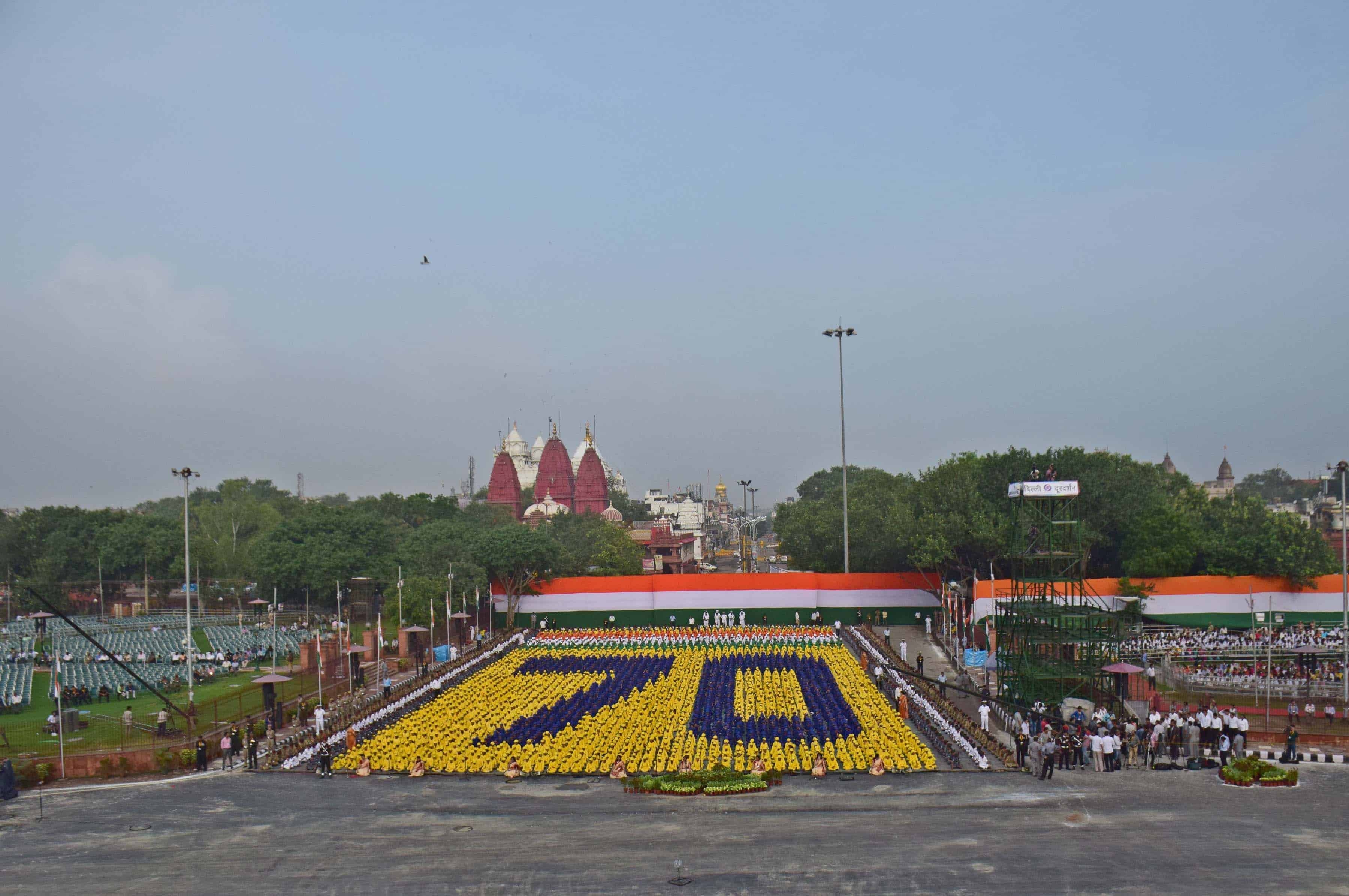 School children formed the figure ’70’ during the Dress Rehearsal of the 70th Independence Day at the forecourt of Red Fort, in New Delhi on Saturday. UNI PHOTO