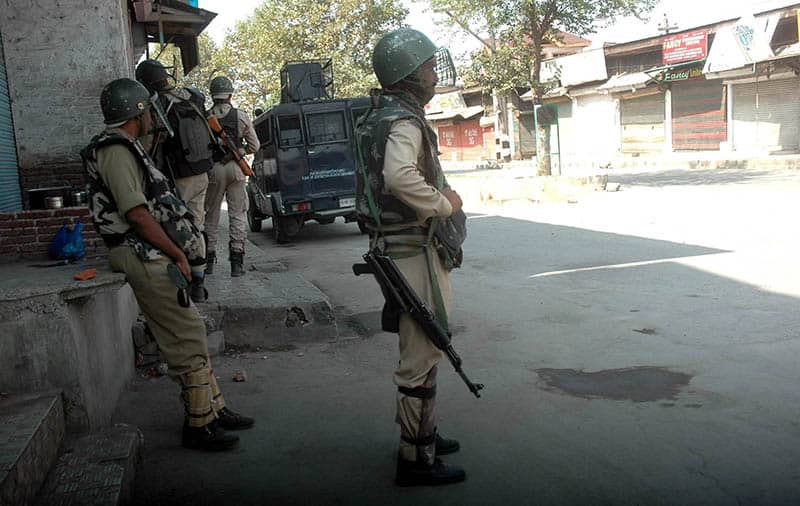 SRINAGAR, SEP 10 (UNI):- Security personnel maintain vigil at Nowhatta in down town Srinagar as restrictions remain in place in major parts of Kashmir valley aimed separatist strike call on the 64th consecutive day on Saturday. UNI PHOTO-17U
